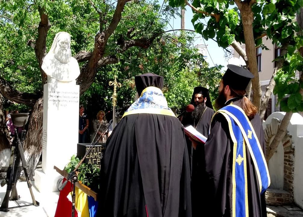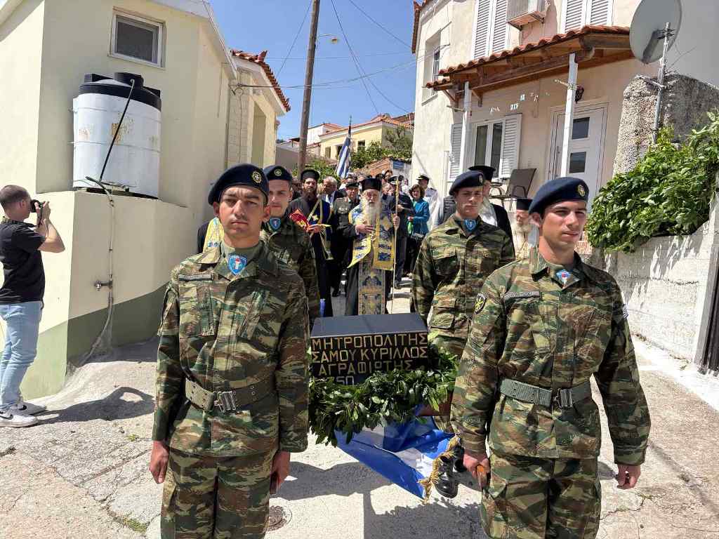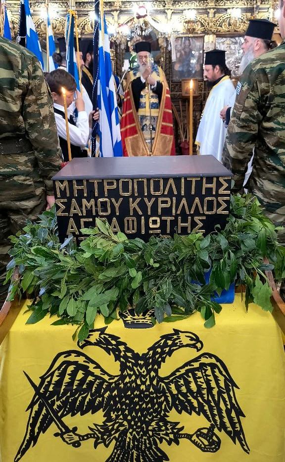 Ακολούθως εν πομπή μετέβη έμπροσθεν του ανδριάντος του αειμνήστου Αρχιεπισκόπου Σάμου Κυρίλλου και των ιερών αυτού λειψάνων τέλεσε Επιμνημόσυνη Δέηση. Τον πανηγυρικό της ημέρας εκφώνησε ο Καθηγητής Λαογραφίας και Κοσμήτορας του Δημοκριτείου Πανεπιστημίου Θράκης και Σάμιος κ. Μανώλης Βαρβούνης.