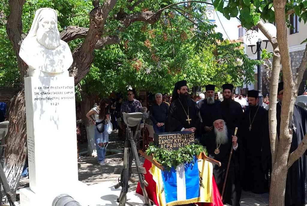 Με λαμπρότητα και εθνική υπερηφάνεια εορτάσθηκε η Επέτειος της υψώσεως της Σημαίας της Σαμιακής Επαναστάσεως 1821 στη πλατεία του Μεσαίου Καρλοβάσου. Ο Σεβασμιώτατος Ποιμενάρχης κ. Ευσέβιος προεξήρχε της Επισήμου Δοξολογίας στον Ιερό Ναό Τιμίου Σταυρού Μεσαίου Καρλοβάσου.