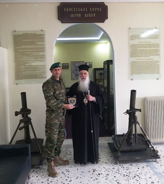 Ο Διοικητής του Στρατοπέδου Αντισυνταγματάρχης κ. Αρτέμιος Δαουλτζής ως ενθύμιο προσέφερε στον Σεβασμιώτατο τιμητική πλακέτα του Στρατοπέδου.