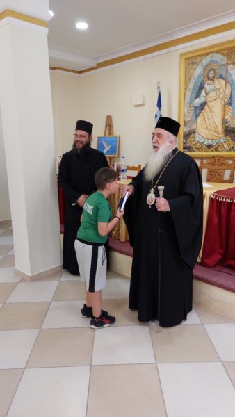 Στη συνεχεία δε στο Πνευματικό Κέντρο της Ιεράς Μητροπόλεώς παρετέθηκε κέρασμα και ως ευλογία ο Σεβασμιώτατος προσέφερε στα παιδιά μας την Καινή Διαθήκη.