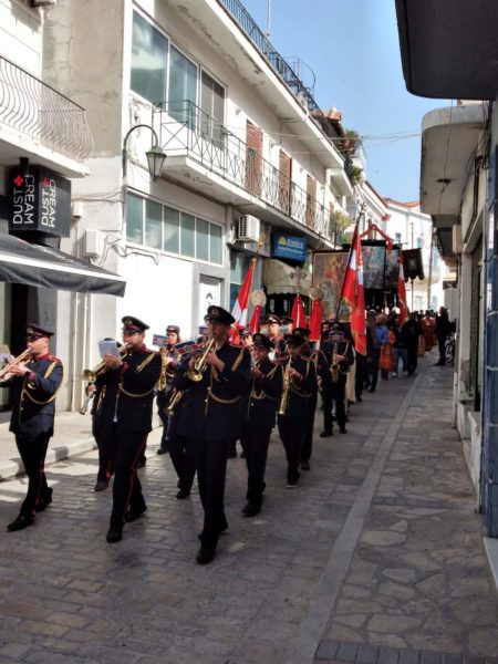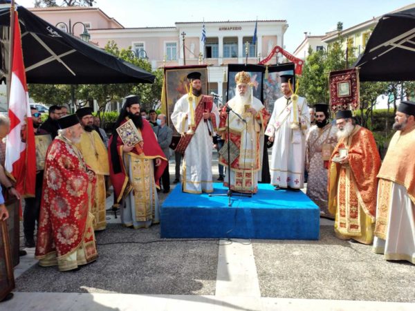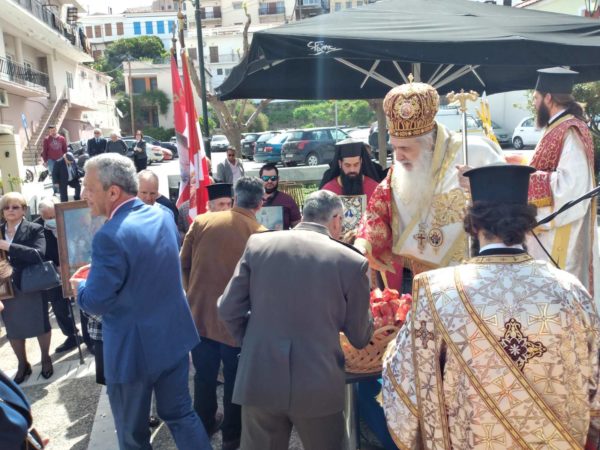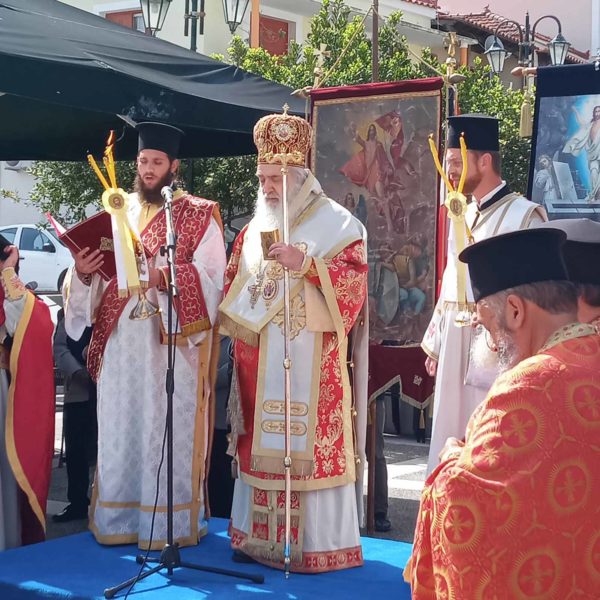 Ο Σεβασμιώτατος Μητροπολίτης Σάμου κ. Ευσέβιος τέλεσε την Θεία Λειτουργία στο πνευματικό κέντρο της Ιεράς Μητροπόλεώς πλησίον του πληγωμένου από τον σεισμό Μητροπολιτικού Ναού (1896) Κοιμήσεως της Θεοτόκου. Στη συνέχεια σχηματίστηκε Εκκλησιαστική πομπή λιτάνευση των Ιερών Εικόνων της Αναστάσεως, των λαβάρων, των σημαιών και των άλλων συμβόλων της Νίκης των ενοριών της πόλεως Κοιμ. Θεοτόκου, Οσίας Ματρώνης και Αγ. Ιωάννου του Χρυσοστόμου.