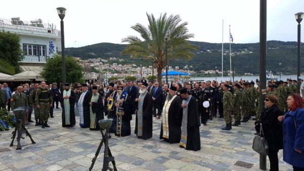 Ακολούθως τέλεσε την επιμνημόσυνη Δέηση στην Κεντρική πλατεία «Πυθαγόρα» πόλεως Σάμου και από της εξέδρας παρηκολούθησε την μαθητική και στρατιωτική Παρέλαση.