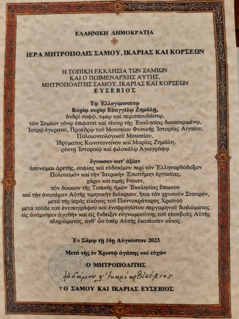 Σε εκδήλωση που πραγματοποιήθηκε την Τετάρτη 16 Αυγούστου 2023 στο Δημαρχιακό Μέγαρο Πυθαγορείου ο Σεβασμιώτατος Μητροπολίτης Σάμου κ. Ευσέβιος απένειμε τον Χρυσό Σταυρό και τον Έπαινο της Τοπικής Εκκλησίας στον κ. Ευάγγελο Ζημέλη για την μέχρι σήμερα πορεία και εξέλιξη του Μουσείου Φυσικής Ιστορίας Αιγαίου “Ίδρυμα Κωνσταντίνου & Μαρίας Ζημάλη”, στους Μυτιληνιούς.