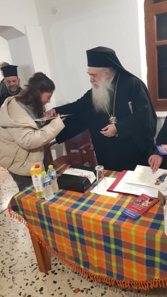 Ο Σεβασμιώτατος προσέφερε σε όλους μικρά φυλλάδια “Ικαριακή Αγιολογία”, τα “Μοναστήρια της Ικαρίας” και στυλό.