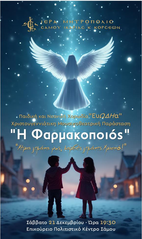 Η Ιερά Μητρόπολη Σάμου και Ικαρίας προσκαλεί στη Χριστουγεννιάτικη εκδήλωση που διοργανώνει εν όψει των εορτών των Χριστουγέννων, όπου θα παρουσιάσει τη μουσικο-θεατρική παράσταση με τίτλο: «Η Φαρμακοποιός», με την Παιδική και Νεανική Χορωδία της, «ΕυΩΔΗα».