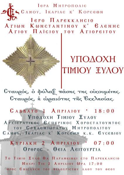 Πέμπτη 6 Απριλίου και ώρα 17.00 μ.μ. Υποδοχή Τιμίου Ξύλου εις τον Ιερόν Ναόν Αγίου Παντελεήμονος Γενικού Νοσοκομείου Σάμου. Ιερό Μηυστήριο του αγίου Ευχελαίου (διά τους ασθενείς).