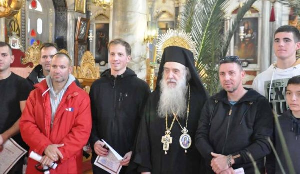Εννέα νέοι βούτηξαν για να ανασύρουν τον Τίμιο Σταυρό στους οποίους ο Σεβασμιώτατος προσέφερε ευλογίες.