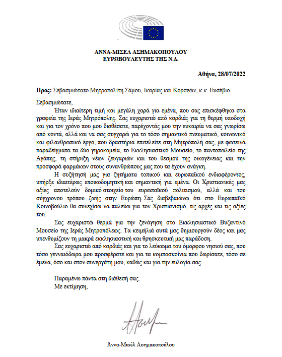 Επίσκεψη στον Σεβασμιώτατο Μητροπολίτη Σάμου κ. Ευσέβιο πραγματοποίησε η Ευρωβουλευτής Άννα-Μισέλ Ασημακοπούλου την Τετάρτη 27 Ιουλίου 2022.