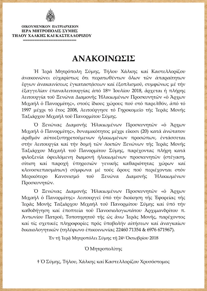 Την έναρξη λειτουργίας του Ξενώνα Διαμονής Ηλικιωμένων Προσκυνητών “Ο Άρχων Μιχαήλ ο Πανορμίτης”, ανακοινώνει η Ιερά Μητρόπολη Σύμης, Τήλου, Χάλκης και Καστελορίζου.