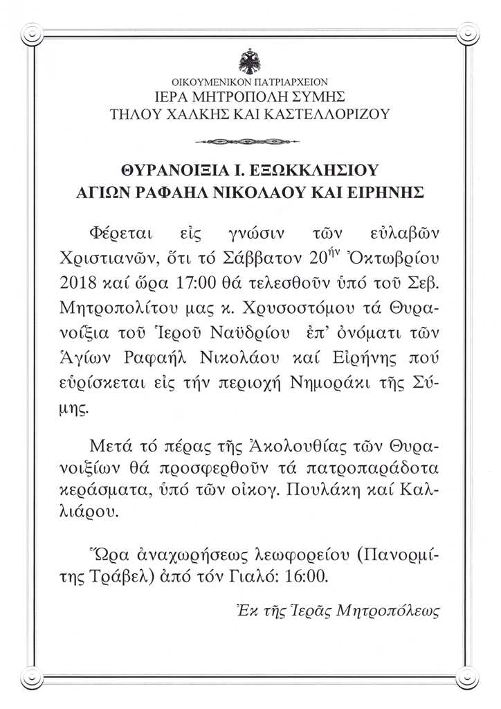 Τα θυρανοίξια του Ιερού Ναϋδρίου, επ’ ονόματι των Αγίων Ραφαήλ, Νικολάου και Ειρήνης, που βρίσκεται στην περιοχή Νημοράκι της Σύμης, αναμένεται να τελέσει το Σάββατο 20 Οκτωβρίου, ο Σεβασμιώτατος Μητροπολίτης Σύμης, Τήλου, Χάλκης και Καστελλορίζου, κ. Χρυσόστομος. Η τελετή των θυρανοιξίων αναμένεται να πραγματοποιηθεί στις 17.00.