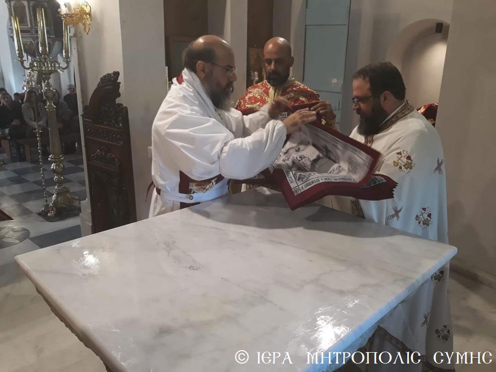 Μετά τήν ἀποπεράτωση αὐτῶν καί ὀλίγον πρό τῆς πανηγύρεως τοῦ Ἱ. Ναοῦ, ὁ Σεβασμιώτατος πραγματοποίησε τήν διατεταγμένη Ἀκολουθία ἐπὶ Σαλευθείσης Ἁγίας Τραπέζης καί ἐν συνεχείᾳ τήν πρώτη Θεία Λειτουργία, προκειμένου ὁ περικαλλής καί ἱστορικός αὐτός Ἱ. Ναός νά ἀποδοθεῖ καί πάλι στήν Λατρεία τοῦ ἐν Τριάδι Θεοῦ. Ταυτοχρόνως ἐγένετο καί ἡ καθιέρωσις τῶν Ἱ. Ἀντιμηνσίων.