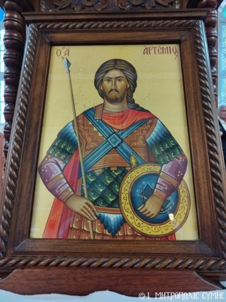 Καθ’ ότι ο Άγιος Αρτέμιος είναι Προστάτης της Ελληνικής Αστυνομίας, με την παρουσία του Δημάρχου Σύμης κ. Ελευθ. Παπακαλοδούκα, τιμητικής αντιπροσωπείας του Αστυνομικού Τμήματος Σύμης με επικεφαλής τον κ. Δημοσθένη Κοτσιλάρα, του Διοικητού της Δ.Α.Ν. Σύμης, Συνταγματάρχου κ. Γεωργίου Ζιώγα, των λοιπών φορέων και Συλλόγων της Σύμης, πραγματοποιήθηκε ιερά Αρτοκλασία, η καθιερωμένη επίσημη Δοξολογία και εν συνεχεία λιτανεία του Ιερού Λειψάνου και της εικόνας του Αγίου πέριξ του Ι. Ναού.