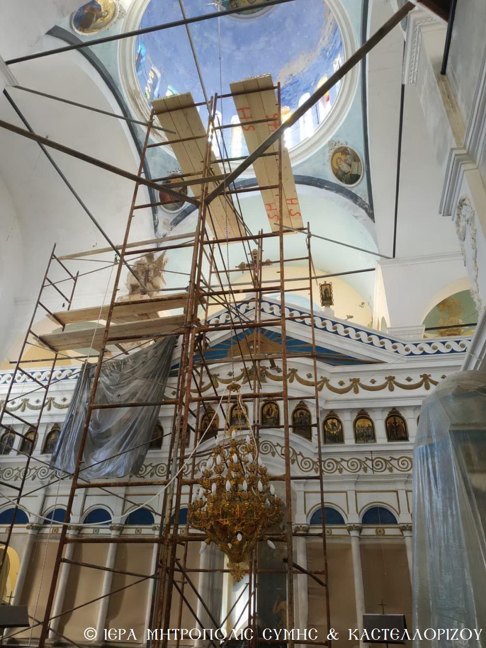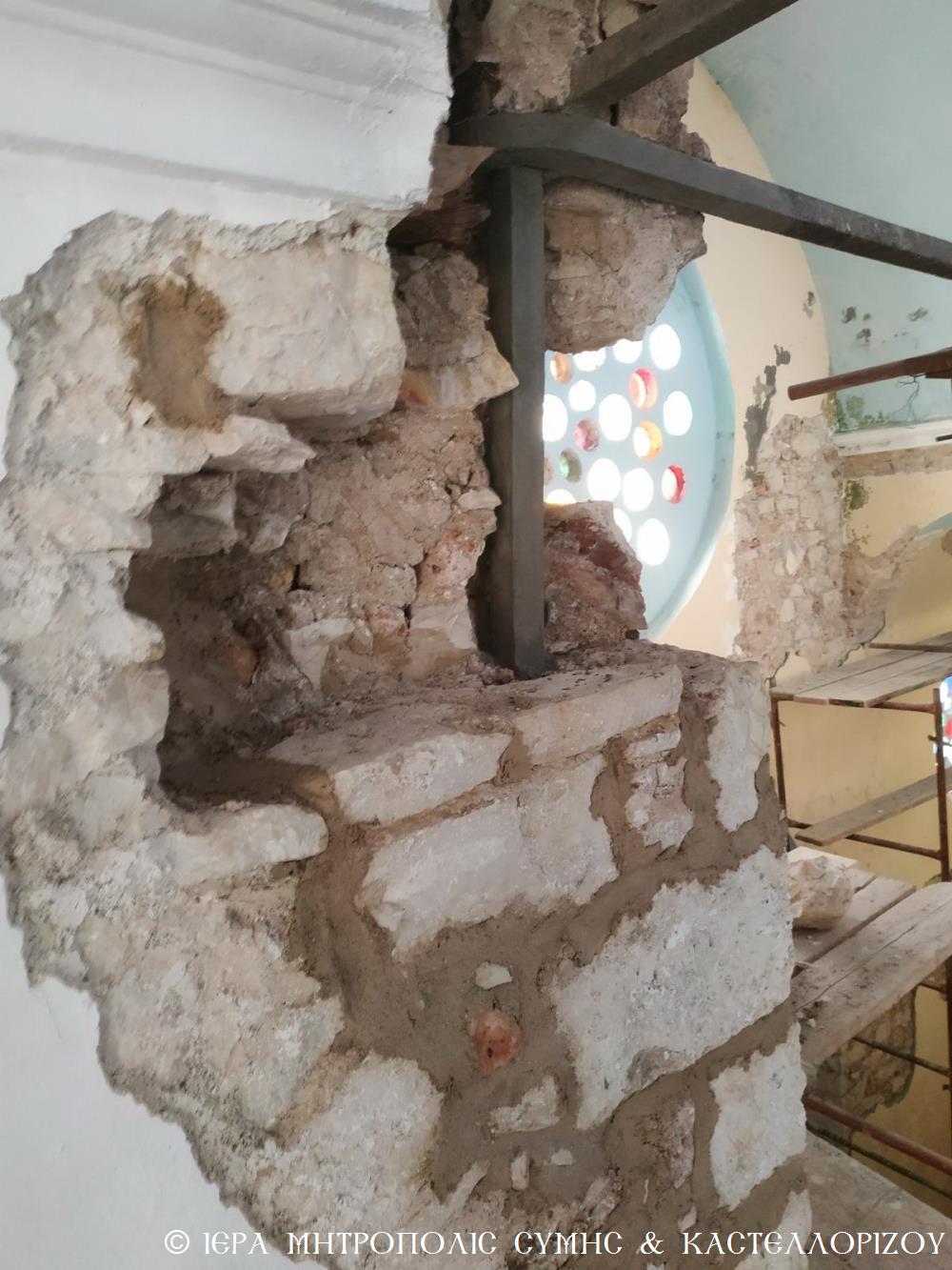 Ὡσαύτως παραθέτομεν φωτογραφικό ὑλικό ἀπό τάς ἐν ἐξελίξει ἀνακαινιστικάς καί στερεωτικάς ἐργασίας τοῦ Ἱ. Ναοῦ Ἁγίου Γεωργίου Πηγαδιοῦ Καστελλορίζου, τήν ὑλοποίησιν τῶν ὁποίων ἔχει ἀπό ἔτους καί πλέον ἀναλάβει ἡ καθ’ ἡμᾶς Ἱερά Μητρόπολις Σύμης, τῇ συνδρομῇ καί προσφορᾷ εὐλαβῶν ἐξ Αὐστραλίας Καστελλοριζίων καί ἄλλων τινων, οἵτινες καταθέτουν τόν ὀβολόν τῆς συμμετοχῆς των εἰς τόν ἐν τῇ Ἐθνικῇ Τραπέζῃ Λογαριασμόν τῆς Ἱ. Μητροπόλεως ὑπ’ ἀριθ. ΙΒΑΝ GR 57 0110 8320 0000 832 290 00092 μέ αἰτιολογία «Ἅγιος Γεώργιος Πηγαδιοῦ», ὥστε ἐν συνεχείᾳ νά ἐκδίδονται ἀπό τήν Ἱ. Μητρόπολη καί νά ἀποστέλλονται στούς εὐλαβεῖς δωρητές οἱ ἀπαραίτητες ταμειακές ἀποδείξεις.