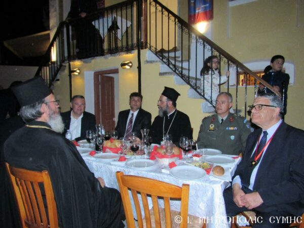Ἀμέσως μετά ὁ Σεβασμιώτατος ἔκοψε ἀπό κοινοῦ μέ τόν Δήμαρχο τήν κορδέλα καί ἔρρανε μέ τόν Ἁγιασμό τούς ἀνακαινισμένους χώρους τοῦ κτιρίου, τούς ὁποίους ἐν συνεχείᾳ ἐπισκέφθηκαν οἱ παριστάμενοι κληρικοί, οἱ ἐπίσημοι καί ὁ κόσμος, πού συμμετεῖχε στήν τελετή. Ἀκολούθησε ὄμορφο μουσικοχορευτικό πρόγραμμα μέ παραδοσιακούς χορούς στόν αὔλιο χῶρο, ἀπό τό χορευτικό τμῆμα τῆς Ἑνώσεως Γυναικῶν Σύμης καί τήν ὀρχήστρα τοῦ κ. Μιχ. Μισσοῦ, ἐνῶ ἡ ἑορταστική βραδιά ἔληξε μέ τήν παράθεση πλουσίων ἐδεσμάτων καί γλυκισμάτων, τήν προετοιμασία τῶν ὁποίων ἐπιμελήθηκαν ἀριστοτεχνικά ἡ κ. Δούκισσα Κρητικοῦ καί ὁ κ. Ἐμμανουήλ Κυπριώτης.