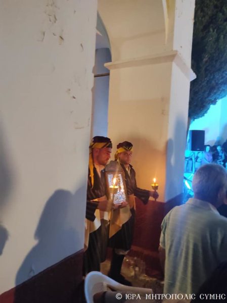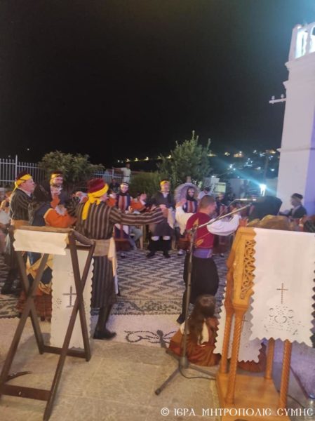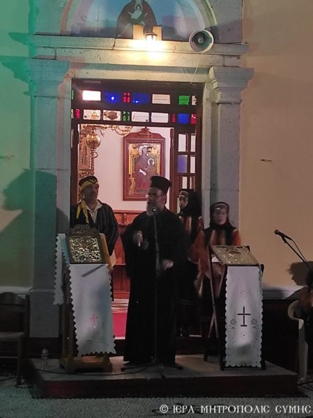 Σε φορτισμένη συναισθηματικά ατμόσφαιρα και με απόλυτη θρησκευτική ευλάβεια, οι Ιερές Εικόνες εισοδεύτηκαν από μέλη του Συλλόγου «Ο ΓΛΑΥΚΟΣ» με παραδοσιακές της Καππαδοκίας φορεσιές και υπό τον ήχο πένθιμων κωδονοκρουσιών προκαλώντας ρίγη συγκινήσεως στους παρευρισκομένους οι οποίοι προσήλθαν αθρόα για να παρακολουθήσουν το ιδιαίτερο και πρωτόγνωρο, για τα τοπικά τουλάχιστον δεδομένα, δρώμενο που από το ξεκίνημά του μέχρι και το τέλος κράτησε αδιάπτωτο το ενδιαφέρον, ανεβάζοντας διαρκώς την συγκινητική φόρτιση όλων των παρευρισκομένων στα ύψη. Την εκδήλωση άνοιξε ο πρόεδρος του συλλόγου Συμαίων Ρόδου ο «ΓΛΑΥΚΟΣ» κ. Σωτήρης Ζουρούδης καλησπερίζοντας και καλοσωρίζοντας τους προσκεκλημένους.