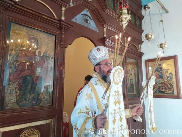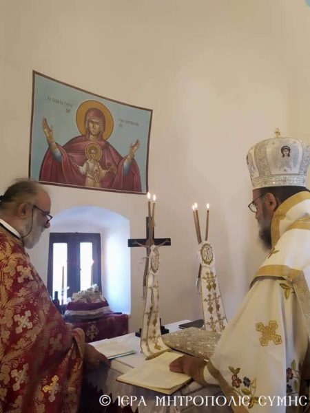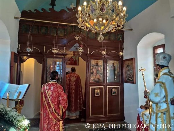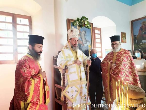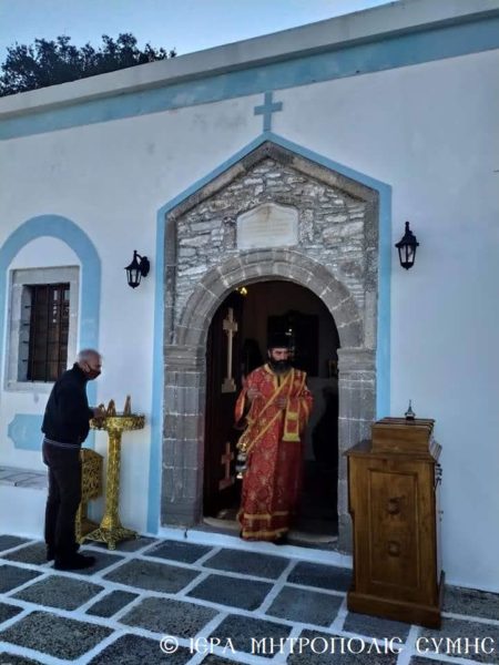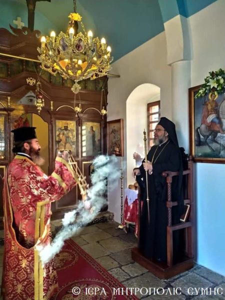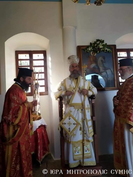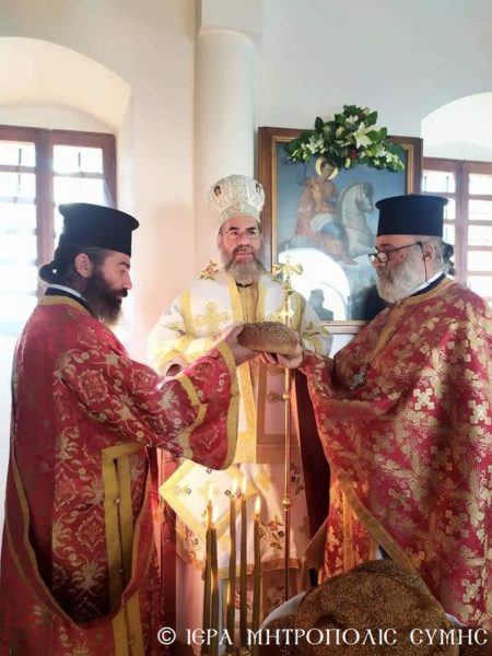 Ο Σεβασμιώτατος Μητροπολίτης κ. Χρυσόστομος χοροστάτησε στον Όρθρο και τέλεσε την Θεία Λειτουργία, με συλλειτουργούς του τον π. Στέφανο Μακρή Γεν. Αρχιερατικό Επίτροπο και τον Διάκονο π. Γεώργιο Κακακιό. Μετά την ανάγνωση του Ιερού Ευαγγελίου ομίλησε επικαίρως στους εκκλησιαζομένους πιστούς που ήλθαν στον Ι. Ναό του Αγίου, μεταξύ των οποίων και ο Δήμαρχος Σύμης κ. Ελευθ. Παπακαλοδούκας, για να προσκυνήσουν την χαριτόβρυτο εικόνα του και να λάβουν την ευλογία της Χάρης Του.