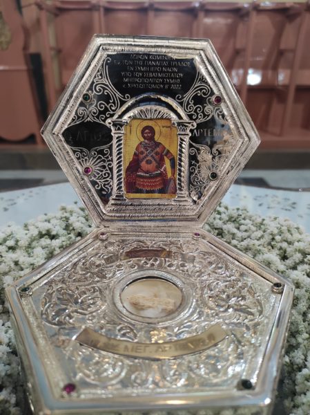 Ο Σεβασμιώτατος κόμισε και προσέφερε στην Ενορία της Αγίας Τριάδος τεμάχιο Ιερού Λειψάνου του Αγίου Αρτεμίου, ο οποίος ανέκαθεν τιμάται από τους ευλαβείς Ενορίτες, τοποθετημένο σε περίτεχνη αργυρή λειψανοθήκη, κατασκευασμένη ιδίοις αυτού εξόδοις, προκειμένου ως υψίστη ευλογία των κατοίκων, ο πνευματικός αυτός θησαυρός να παραμείνει εκεί εσαεί.