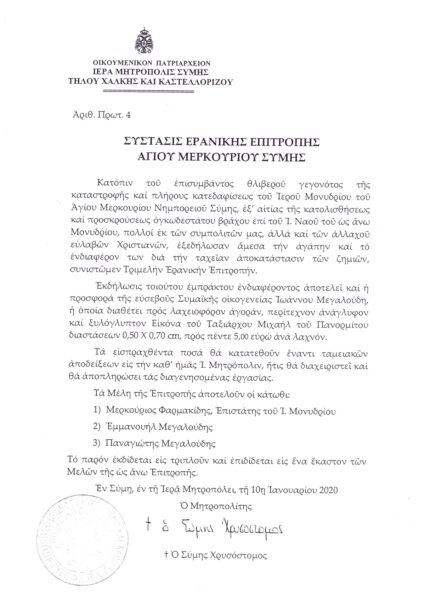 “Ἡ Ἱερά Μητρόπολις Σύμης, κατόπιν τοῦ πρό ἡμερῶν ἐπισυμβάντος θλιβεροῦ γεγονότος τῆς καταστροφῆς καί πλήρους κατεδαφίσεως τοῦ Ἱεροῦ Μονυδρίου τοῦ Ἁγίου Μερκουρίου Νημπορειοῦ Σύμης, ἐξ’ αἰτίας τῆς κατολισθήσεως καί προσκρούσεως ὀγκωδεστάτου βράχου ἐπ’ αὐτοῦ, λαβοῦσα ὑπ’ ὄψιν ὅτι πολλοί ἐκ τῶν συμπολιτῶν μας, ἀλλά καί τῶν ἀλλαχοῦ εὐλαβῶν Χριστιανῶν, ἐξεδήλωσαν ἄμεσα τήν ἀγάπην καί τό ἐνδιαφέρον των διά τήν ταχεῖαν ἀποκατάστασιν τῶν ζημιῶν, συνιστᾶ διά τόν σκοπόν αὐτόν, Τριμελήν Ἐρανικήν Ἐπιτροπήν.