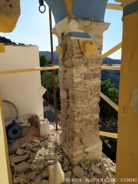 Σε εξέλιξη βρίσκονται εργασίες αποκαταστάσεως και συντηρήσεως του Κωδωνοστασίου του ιστορικού Ιερού Ναού Αγίου Παντελεήμονος Άνω Χώρας Σύμης, το οποίο από ετών λόγω πολλών φθοροποιών παραγόντων έχει υποστεί διευρυμένες ρωγμές, που θέτουν σε υψηλή επικινδυνότητα το μνημείο και δημιουργούν μέγιστα προβλήματα στατικότητος.