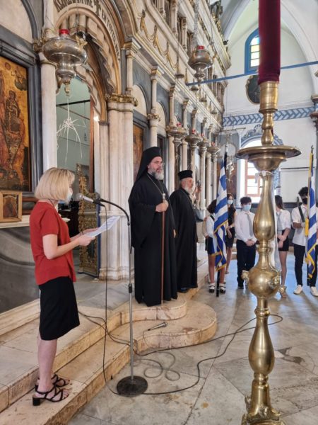 Εν συνεχεία, ακολούθησε η επίσημη Δοξολογία επί τη 78η επετείω της απελευθερώσεως της Νήσου στον Μητροπολιτικό Ι. Ναό Αγίων Κωνσταντίνου και Ελένης, προεξάρχοντος του Σεβ. Ποιμενάρχου κ. Χρυσοστόμου, κατά την οποία η Διευθύντρια του Γυμνασίου-Λυκείου κ. Μπέτυ Μούζακ εκφώνησε τον Πανηγυρικό της ημέρας.