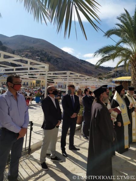 Παρόντες οι εκπρόσωποι όλων των τοπικών Στρατιωτικών, Αστυνομικών και Λιμενικών Αρχών, με επικεφαλής τον Δήμαρχο Σύμης κ. Ελευθέριο Παπακαλοδούκα και Μέλη του Δημοτικού Συμβουλίου. Εφέτος, σύμφωνα με τα ισχύοντα υγειονομικά μέτρα, παρέστησαν μόνο αντιπροσωπείες Εκπαιδευτικών και Μαθητών των Σχολείων της Νήσου, πλαισιώνοντας την Γαλανόλευκη.