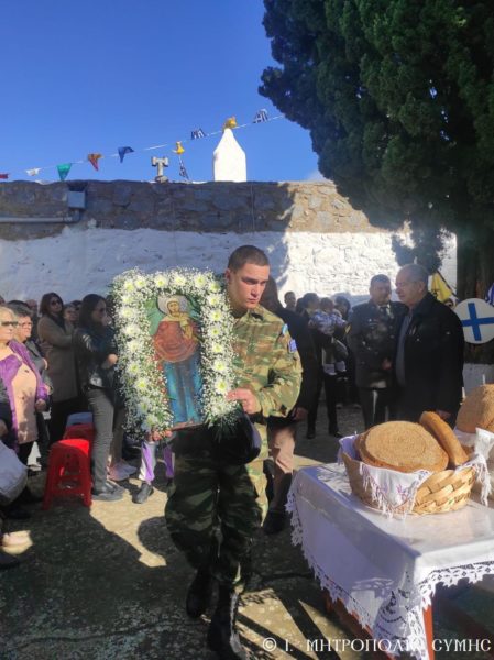 Εκτός όμως απ’ την μεγάλη εκτίμηση που της πρόσφεραν οι γυναίκες, και οι άνδρες με τη σειρά τους την εκτίμησαν, και η δυναμικότητα της προστασίας της έγινε το ιερό σύμβολο του Πυροβολικού στους ακούραστους οπλίτες των περισσότερων κρατών του κόσμου. Για τον λόγο αυτό, στον σημερινό εκκλησιασμό παρέστη και στρατιωτική αντιπροσωπεία της Δ.Α.Ν. Σύμης, προκειμένου να τιμηθεί επαξίως η μνήμη της Αγίας ως Προστάτιδος του Πυροβολικού και να εξασφαλίζεται η υψηλή προστασία της στους Οπλίτες, αλλά και στον κάθε πιστό που επικαλείται τις θείες πρεσβείες της.
