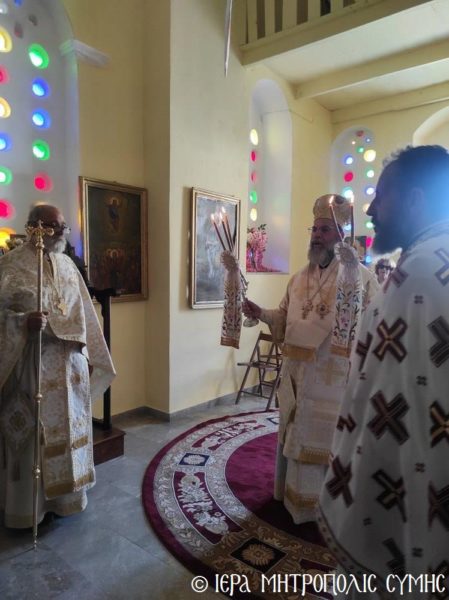 Συλλειτούργησαν ο Γεν. Αρχιερατικός Επίτροπος π. Στέφανος Μακρής, ο π. Αντώνιος Μανιάς και ο π. Γεώργιος Κακακιός. Το αναλόγιο διακόνησε ο Ιεροψάλτης κ. Αγαπητός Μιχελλής, ο οποίος διά της ιεράς υμνωδίας, συνέβαλε καθοριστικά στην πνευματική ανάταση των πιστών, που για μια ακόμη χρονιά κατέκλυσαν τον πανηγυρίζοντα Ιερό Ναό, ο οποίος, σημειωτέον, κοσμείται με εκπληκτικής ξυλογλυπτικής τέχνης τέμπλο και ιερές Εικόνες, μεταφερθέντα από τις έναντι αλησμόνητες Πατρίδες, ολίγον προ της τραγωδίας εκείνου του μαύρου θέρους του 1922.