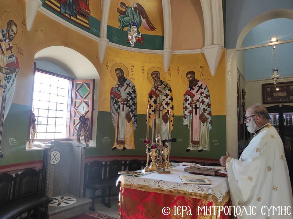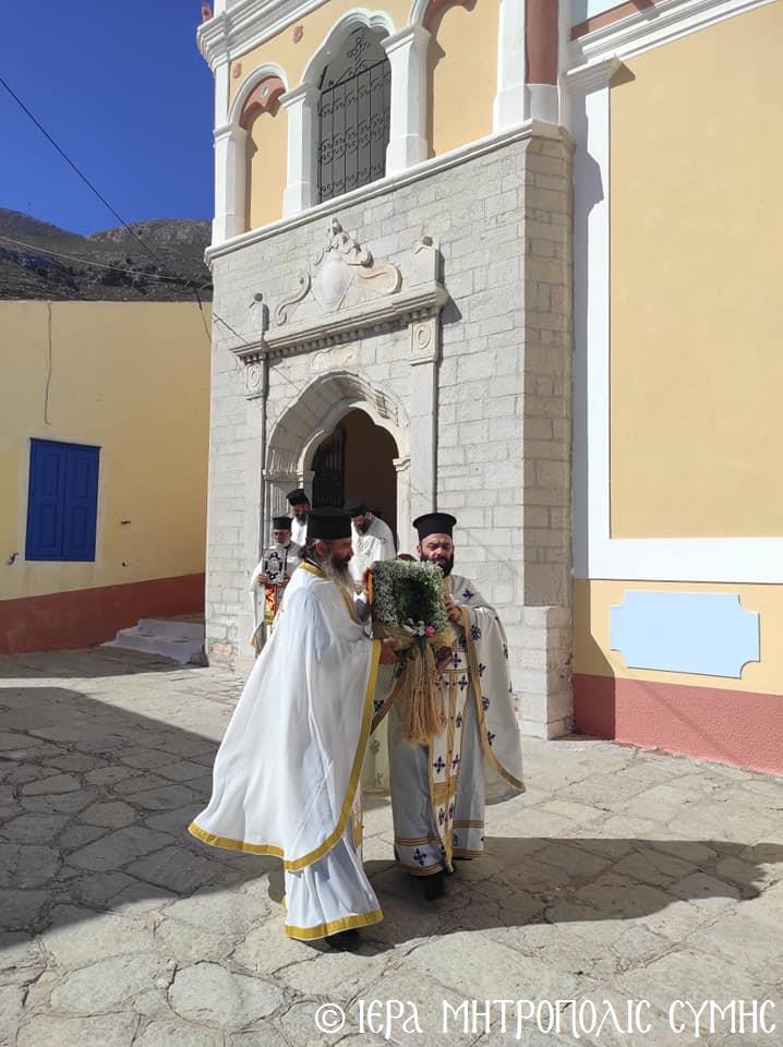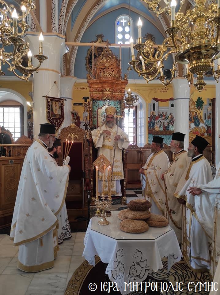 Συλλειτουργούς του είχε τον Γεν. Αρχιερατικό μας Επίτροπο Πρωτοπρ. Στέφανο Μακρή, τον Εφημέριο της Ενορίας, Οικονόμο π. Ελευθέριο Οθείτη, άπαντας τους Εφημερίους της Σύμης και τον Ιεροδιάκονο π.Παύλο Τερεζάκη, ενώ το ιερό αναλόγιο διακόνησαν οι Ιεροψάλτες κ. Πανορμίτης Κακακιός και κ. Ελευθέριος Ξηράκης.