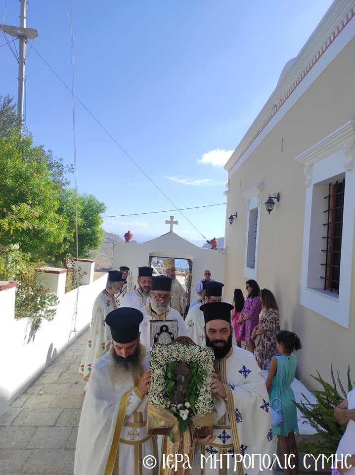 Προ της απολύσεως, ο Σεβασμιώτατος προέστη της λιτανεύσεως της Ι. Εικόνας της Παναγίας Γλυστριανής πέριξ του Ι. Ναού, ενώ μετά το τέλος της λατρευτικής Συνάξεως, προσεφέρθησαν εις το παρακείμενο ενοριακό κέντρο τα πατροπαράδοτα κεράσματα της Συμαικής φιλοξενίας, ώστε το κλίμα της πνευματικής χαράς και ευφροσύνης, να επισφραγισθεί και με την ευλογημένη ευκαιρία της διαπροσωπικής επικοινωνίας και επαφής των ανθρώπων. Το βράδυ, πρόκειται να λάβει χώρα στον προαύλιο χώρο του Ιερού Ναού Αγίου Αθανασίου και το παραδοσιακό πανηγύρι με μουσικοχορευτικό πρόγραμμα και δωρεάν φαγητά και ποτά, με ευγενή χορηγία του Δήμου Σύμης.