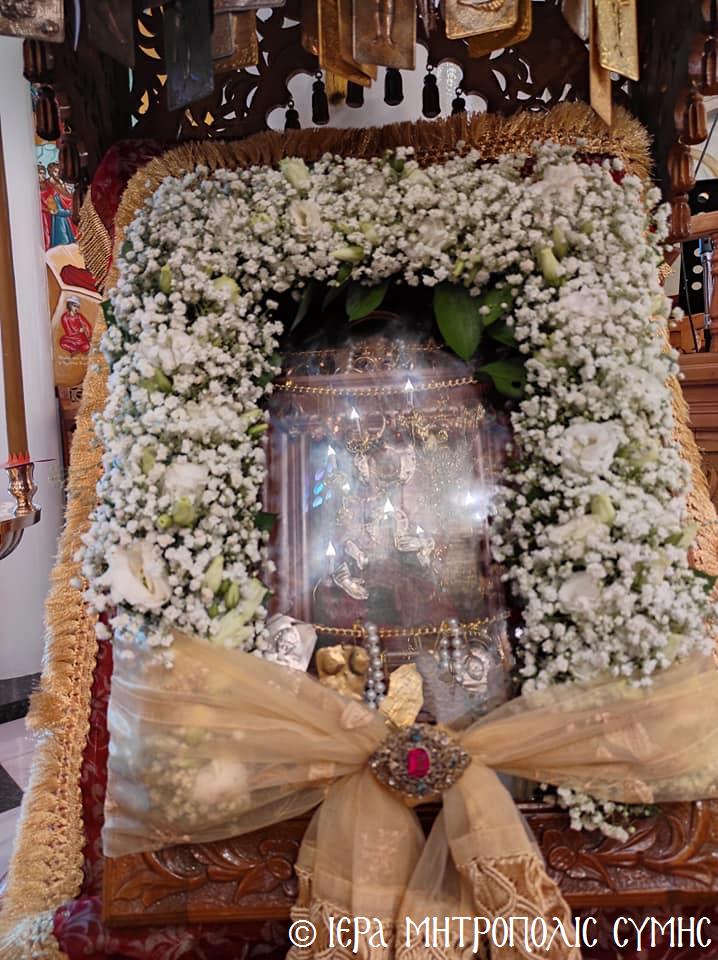 Ο Σεβασμιώτατος, απευθυνόμενος στο ευάριθμο εκκλησίασμα, ανεφέρθη εις το περιεχόμενον της εορτής της Τιμίας Ζώνης, αλλά και εις το ιστορικό της Ιεράς Εικόνος της Παναγίας «Γλυστριανής», η οποία προέρχεται από τα μαρτυρικά χώματα της Μικράς Ασίας και αρχικά ήταν κτήμα της οικογενείας Αννίκας Κάτρη – Καιλλή (Μπουμπουριάς), που την μετέφερε με τον ξεριζωμό του 1922 στην Σύμη και σε μεταγενέστερο χρόνο αφιέρωσε στον ιστορικό Ενοριακό Ναό του Αγίου Αθανασίου.