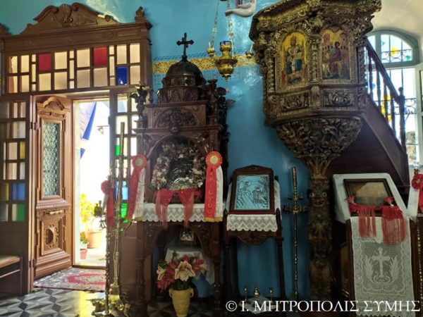 Το επίκεντρο κατέστη ο ομώνυμος Ενοριακός Ι. Ναός που βρίσκεται στον πυρήνα του οικισμού της άνω Χώρας της Σύμης, όπου χοροστάτησε στον Όρθρο και τέλεσε την Θεία Λειτουργία ο Σεβ. Μητροπολίτης κ. Χρυσόστομος, έχοντας συλλειτουργούς του τον Πανοσιολ. Καθηγούμενο της Ι. Μονής Πανορμίτου, Αρχιμανδρίτη π. Αντώνιο Πατρό, τον Αιδεσ. Εφημέριο του Ι. Ναού π. Αντώνιο Μανιά και τον Διάκονο π. Γεώργιο Κακακιό, άγοντα και τα ονομαστήρια αυτού.