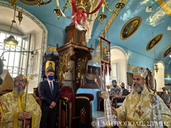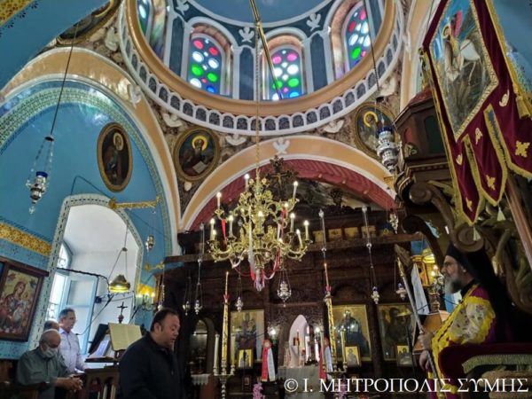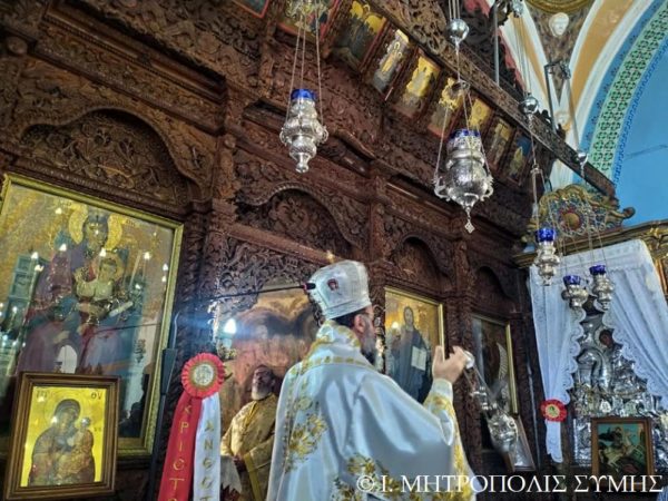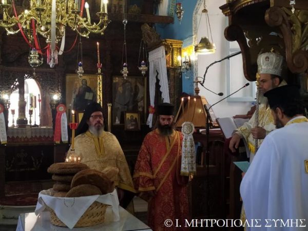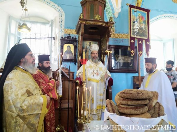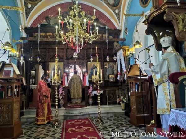 Το επίκεντρο κατέστη ο ομώνυμος Ενοριακός Ι. Ναός που βρίσκεται στον πυρήνα του οικισμού της άνω Χώρας της Σύμης, όπου χοροστάτησε στον Όρθρο και τέλεσε την Θεία Λειτουργία ο Σεβ. Μητροπολίτης κ. Χρυσόστομος, έχοντας συλλειτουργούς του τον Πανοσιολ. Καθηγούμενο της Ι. Μονής Πανορμίτου, Αρχιμανδρίτη π. Αντώνιο Πατρό, τον Αιδεσ. Εφημέριο του Ι. Ναού π. Αντώνιο Μανιά και τον Διάκονο π. Γεώργιο Κακακιό, άγοντα και τα ονομαστήρια αυτού.