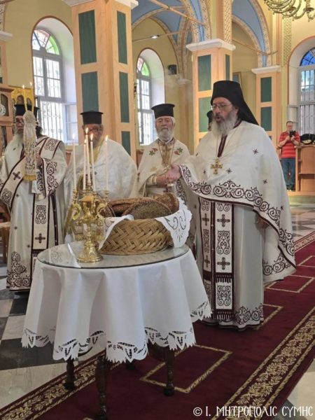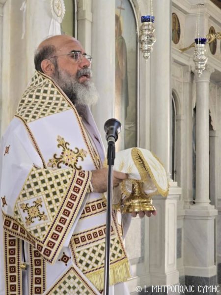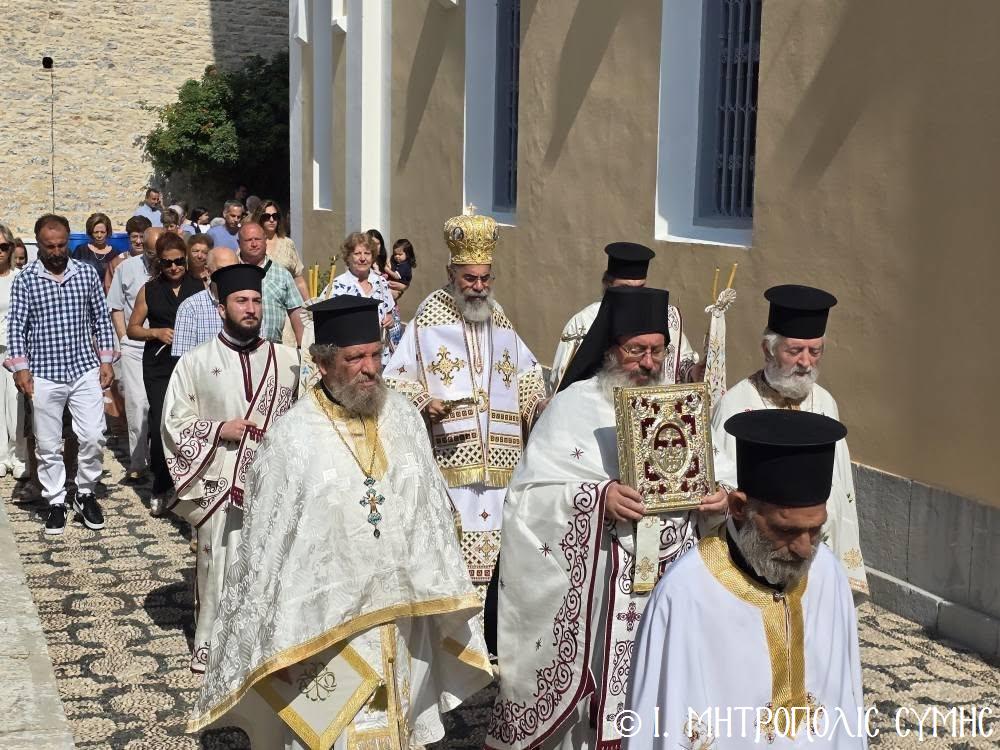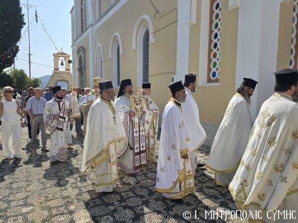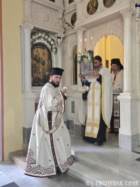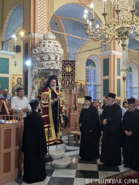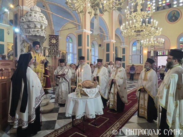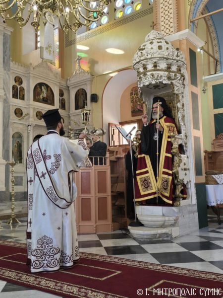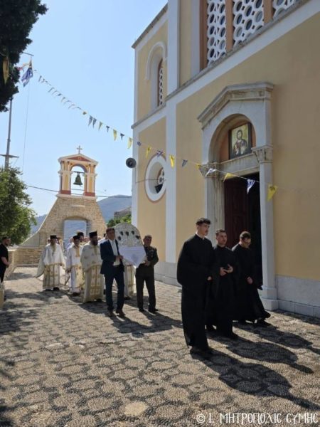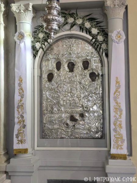 Με την δέουσα εκκλησιαστική τάξη και λαμπρότητα πανηγύρισε το διήμερο 8 και 9 Ιουνίου, εορτή του Αγίου Πνεύματος, η πολυπληθής Ενορία της Αγίας Τριάδος Σύμης. Ο πανηγυρίζων ευμεγέθης Ιερός Ναός δεσπόζει σε περίοπτη θέση στο επάνω μέρος του Χωριού, αποτελώντας αναμφίβολα την αρχιτεκτονική κορωνίδα του γραφικού νεοκλασσικού οικισμού της Συμαικής «Άνω Χώρας».