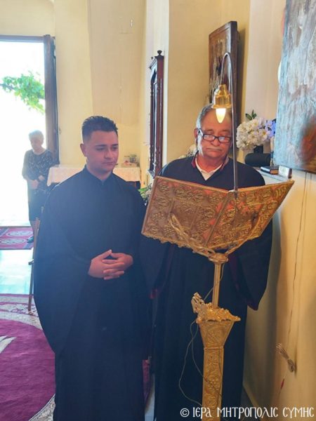 Το αναλόγιο διακόνησαν οι Ιεροψάλτες κ. Αγαπητός Μιχελλής και κ. Ελευθέριος Ξηράκης, οι οποίοι διά της ιεράς υμνωδίας, συνέβαλαν καθοριστικά στην πνευματική ανάταση των πιστών, που για μια ακόμη χρονιά κατέκλυσαν τον πανηγυρίζοντα Ιερό Ναό, ο οποίος, σημειωτέον, κοσμείται με εκπληκτικής ξυλογλυπτικής τέχνης τέμπλο και ιερές Εικόνες, μεταφερθέντα από τις έναντι αλησμόνητες Πατρίδες, ολίγον προ της τραγωδίας εκείνου του μαύρου θέρους του 1922.