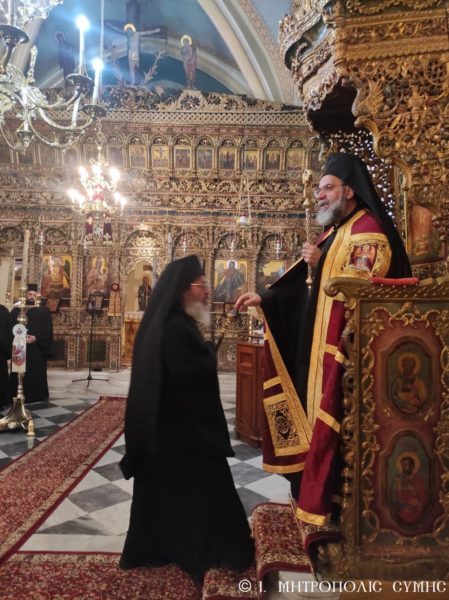 Το απόγευμα της Κυριακής, τελέστηκε ο Μέγας Πανηγυρικός Εσπερινός, χοροστατούντος του Σεβασμιωτάτου Μητροπολίτου Σύμης, Τήλου, Χάλκης και Καστελλορίζου κ. Χρυσοστόμου, συμπαραστατουμένου υπό πάντων των Εφημερίων και Διακόνων της Νήσου μας, ως και του Πανοσιολογιωτάτου Καθηγουμένου της Ιεράς Μονής Πανορμίτου Αρχιμανδρίτου Αντωνίου Πατρού, ο οποίος εξυπηρετεί ως ιερατικώς Προϊστάμενος την συγκεκριμένη Ενορία.