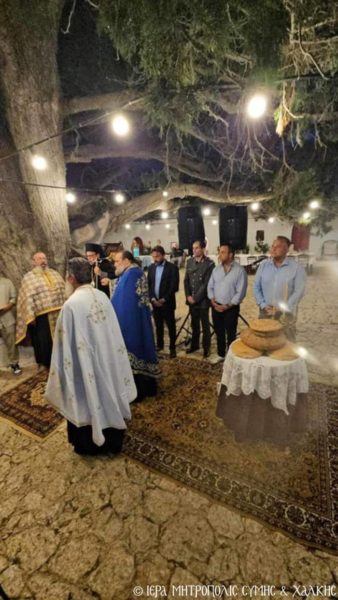 Το εσπέρας τελέσθη ο Μέγας πανηγυρικός Εσπερινός στον αύλιο χώρο της πανηγυρίζουσας Ι. Μονής, με την συμμετοχή εκατοντάδων πιστών και πολλών φιλεόρτων επισκεπτών του νησιού, πρωτίστως όμως Χαλκιτών ντόπιων, αλλά και ξενιτεμένων, συγκαλουμένων υπό του προστάτου Αγίου της αγαπημένης τους ιδιαιτέρας Πατρίδας. Αργότερα και μέχρι τις πρώτες πρωινές ώρες πραγματοποιήθηκε το πατροπαράδοτο λαϊκό γλέντι με ντόπια μουσικά ακούσματα, χορούς και πλούσια εδέσματα προσφερόμενα στην Μονή για τον σκοπό αυτό, από ευσεβείς προσκυνητές.