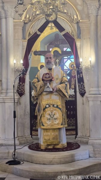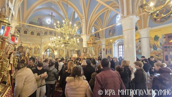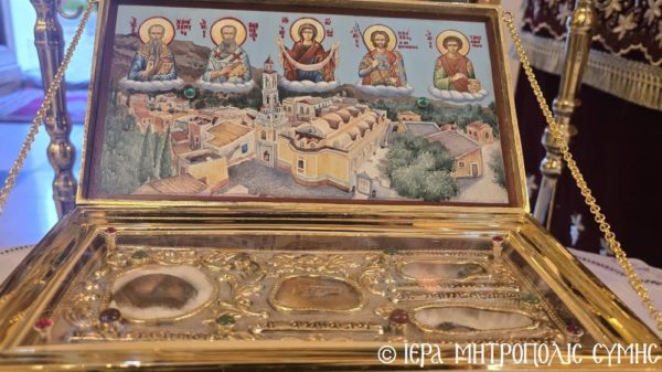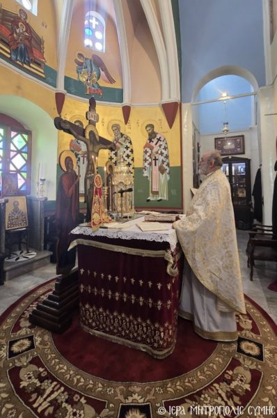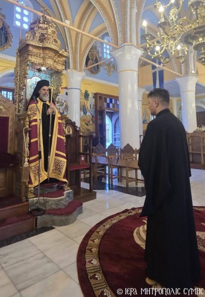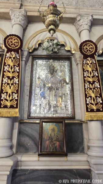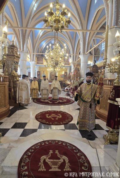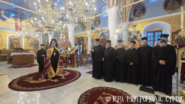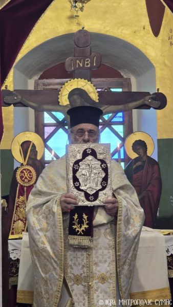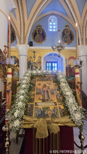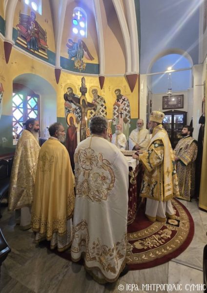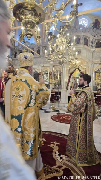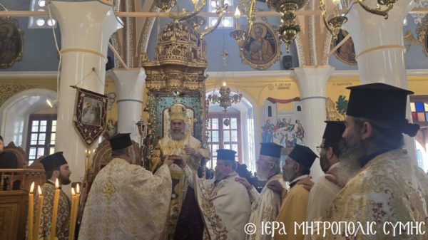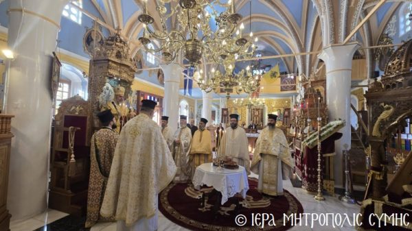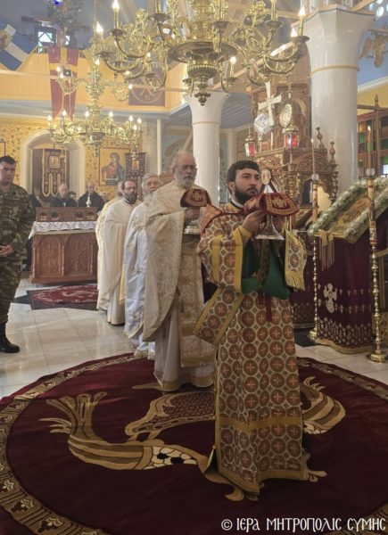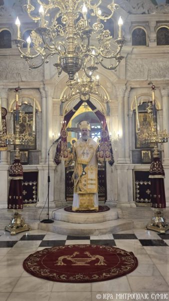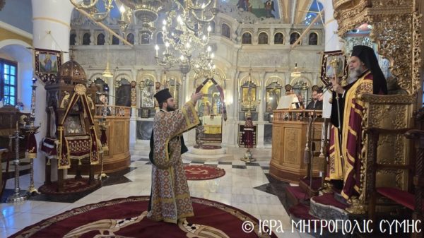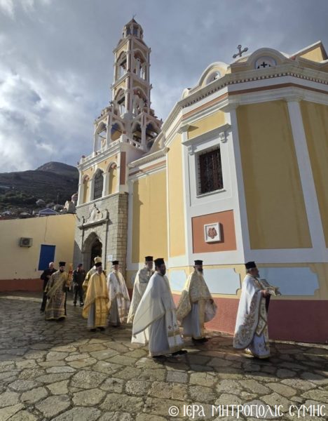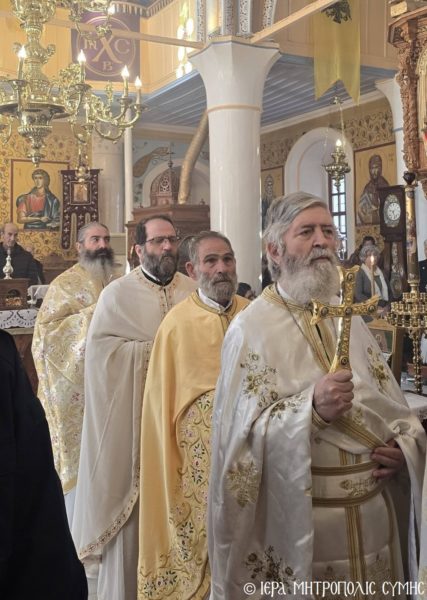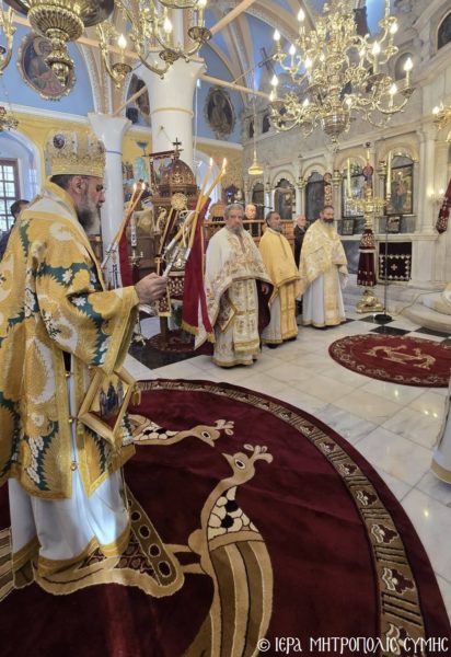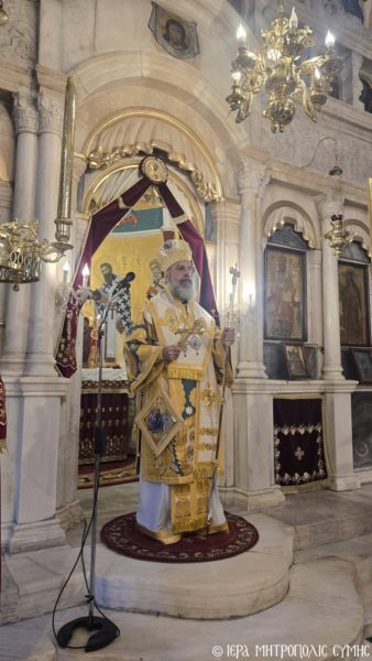 Το πρωί ο Σεβασμιώτατος Μητροπολίτης Σύμης, Τήλου, Χάλκης και Καστελλορίζου κ. Χρυσόστομος χοροστάτησε στον Όρθρο και τέλεσε την Θεία Λειτουργία, με συλλειτουργούς του τον Γενικό Αρχιερατικό Επίτροπο, Πρωτοπρεσβύτερο Στέφανο Μακρή, τον Εφημέριο του Ιερού Ναού Οικονόμο Ελευθέριο Οθίτη, άπαντες τους Εφημερίους της Σύμης, καθώς και τον Ιεροδιάκονο π. Παύλο Τερεζάκη, ενώ το ιερό Αναλόγιο διακόνησαν μελιρρύτως ο Ιεροψάλτης κ. Αγαπητός Μιχελλής και κ. Ελευθέριος Ξηράκης μεθ’ ετέρων.
