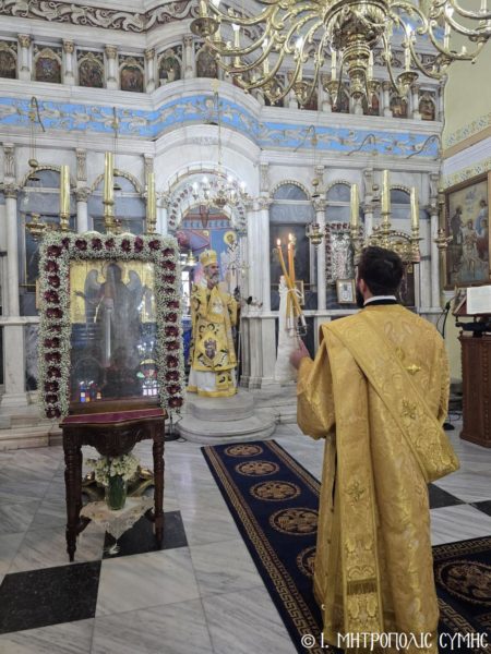 Την κυριώνυμη ημέρα, ο Σεβασμιώτατος Μητροπολίτης κ. Χρυσόστομος χοροστάτησε στον Όρθρο και τέλεσε την Θεία Λειτουργία μετ’ Αρτοκλασίας, με συλλειτουργούς του άπαντες τους ως άνω Κληρικούς. Τα αναλόγια λάμπρυναν κατά την Πανήγυρη, ο Πρωτοψάλτης του Μητροπολιτικού Ιερού Ναού κ. Δημοσθένης Γιανναράς, μετά του Πρωτοψάλτου της Ιεράς Μονής Πανορμίτου κ. Σταύρου Πήλιουρα και οι Ιεροψάλτες κ. Μερκούριος Γιανναράς και κ. Ελευθέριος Ξηράκης, περιστοιχιζόμενοι και εξ ετέρων.