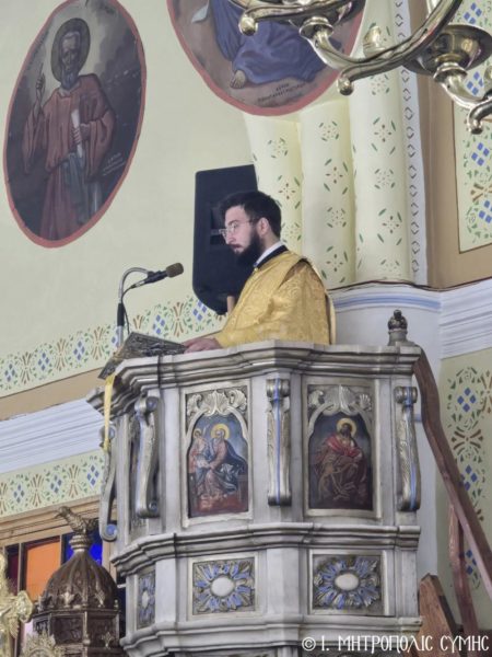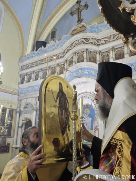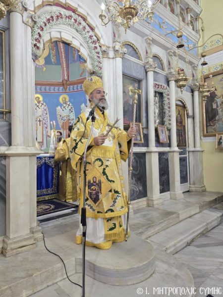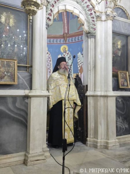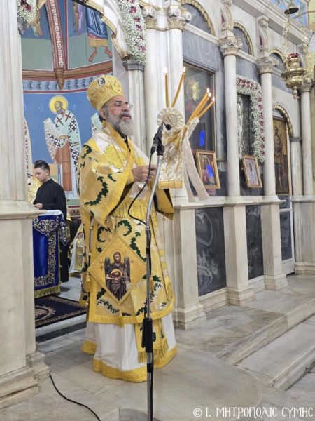 Τον θείο λόγο κήρυξε και πάλι διδακτικότατα ο Σεβασμιώτατος Μητροπολίτης Σύμης κ. Χρυσόστομος, ο οποίος αναφέρθηκε στην σεβασμία μορφή του Τιμίου Προδρόμου, αναλύοντας θεολογικώς την θεία αποστολή και τον βαρυσήμαντο ρόλο του κατά την Βάπτισιν του Κυρίου στον Ιορδάνη Ποταμό, καθ’ ότι υπήρξε ο Όρθρος που ανήγγειλε τον ερχομόν της ημέρας του Κυρίου. Ο Άγιος Ιωάννης κηρύσσει προδρομικώς εις την έρημον ό,τι θα διδάξει αργότερα ο Κύριος στο Ευαγγέλιον, με πέντε βαρυσήμαντες λέξεις: «Μετανοείτε, ήγγικε γαρ η βασιλεία των ουρανών».