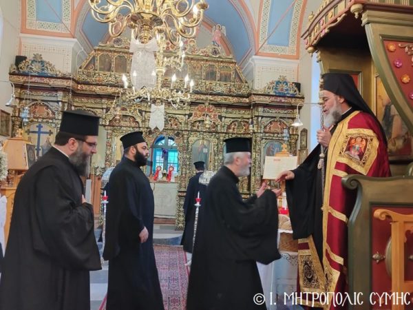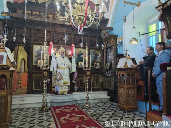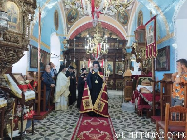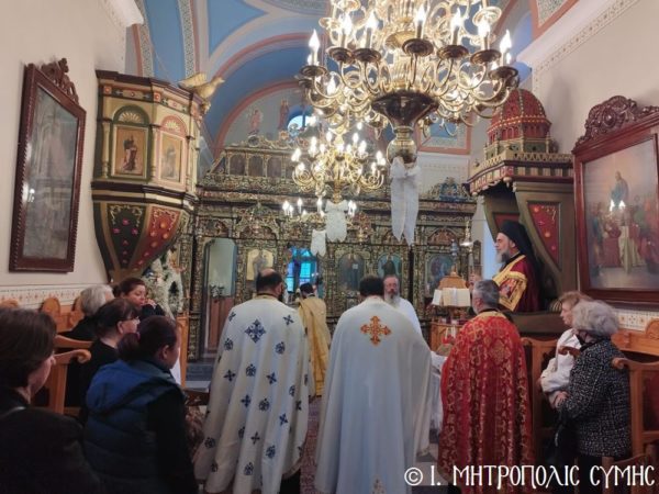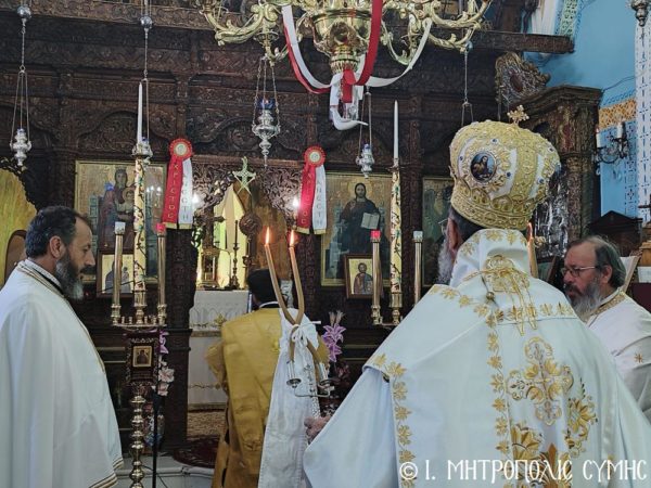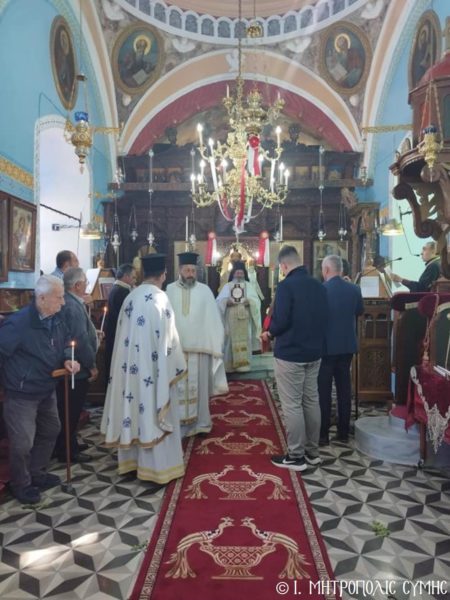 Ο Σεβ. Μητροπολίτης Σύμης, Τήλου, Χάλκης και Καστελλορίζου κ. Χρυσόστομος, κατά το πρόγραμμά του, εχθές το εσπέρας του Πάσχα, χοροστάτησε του Μεγάλου Πανηγυρικού Εσπερινού ώρα 19:00 στον πανηγυρίζοντα Ενοριακόν Ναόν του Αγίου, στο παραθαλάσσιο γραφικό οικισμό του Πεδίου Σύμης, πλαισιούμενος εκ του Πανοσιολ. Αρχιμανδρίτου π. Αντωνίου Πατρού, Καθηγουμένου της Ι. Μονής Πανορμίτου, του Αιδεσ. Εφημερίου του Ι. Ναού Οικονόμου π. Χρήστου Σταθοπούλου, του π. Γεωργίου Χατζηχρυσάφη, του π. Φιλοθέου Κάλφα και του Ιεροδιακόνου π. Παύλου Τερεζάκη.