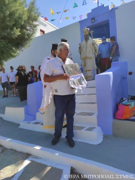 Στην εόρτια λατρευτική σύναξη, έσπευσαν αρκετοί φιλάγιοι προσκυνητές, τους οποίους νωρίς το πρωί μετέφερε από το λιμάνι της Σύμης αφιλοκερδώς το πλοιάριο «Ποσειδών» του Συμαίου πλοιοκτήτου κ. Ιωάννου Γιαννίκου.