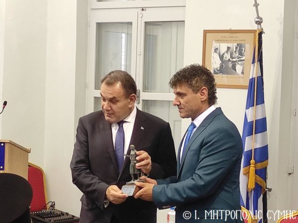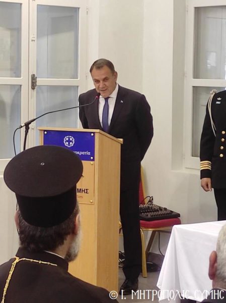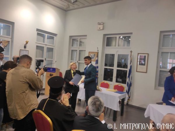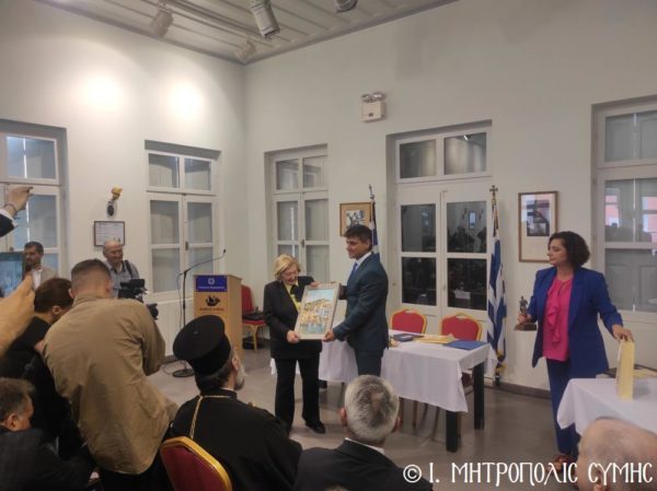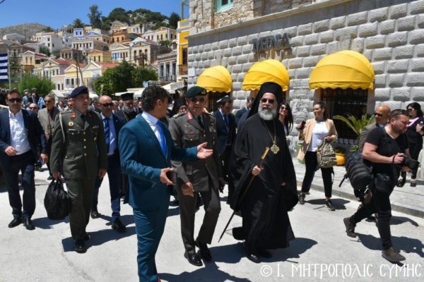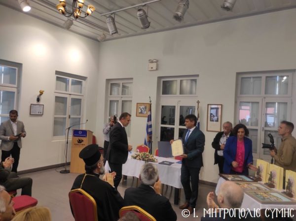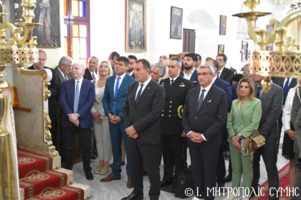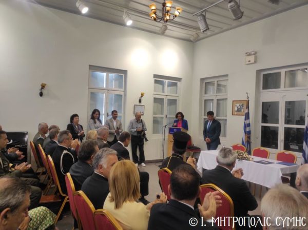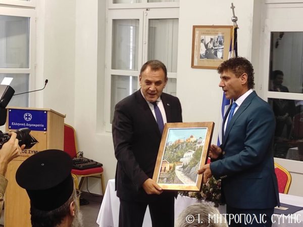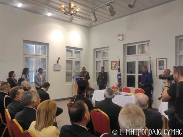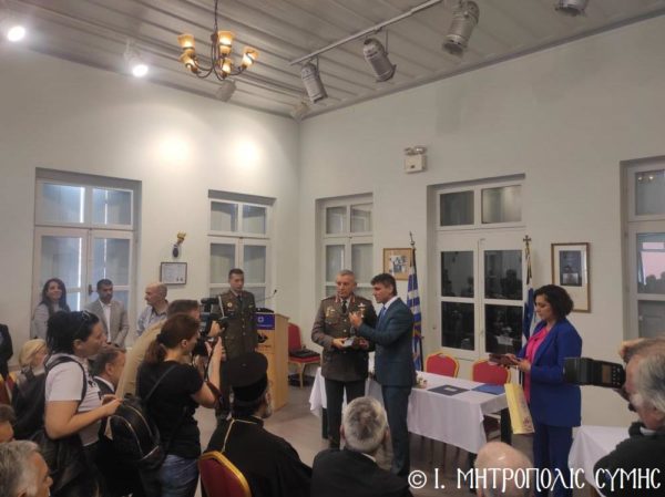 Αρχικά πραγματοποιήθηκε στο Πνευματικό Κέντρο του Δήμου, η ανακήρυξη σε επίτιμο δημότη Σύμης, του Υπουργού Εθνικής Αμύνης κ. Νικόλαου Παναγιωτοπούλου, του Αρχηγού ΓΕΕΘΑ, Στρατηγού Κωνσταντίνου Φλώρου και της κ. Αικατερίνης – Αρτεμισίας (Σάκη) Γεωργιάδου – Κυπραίου.