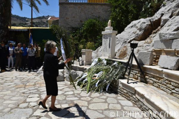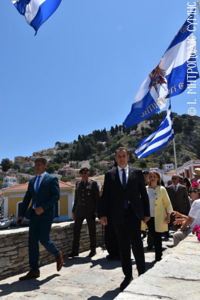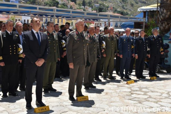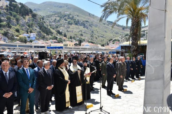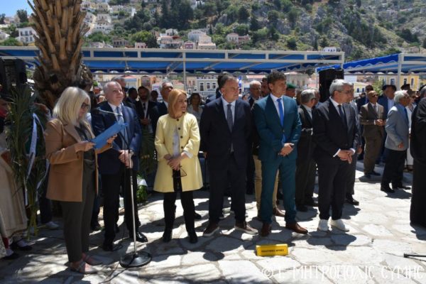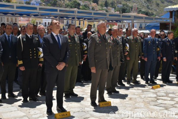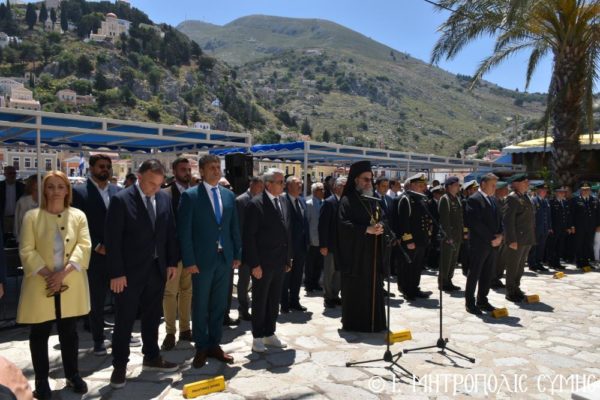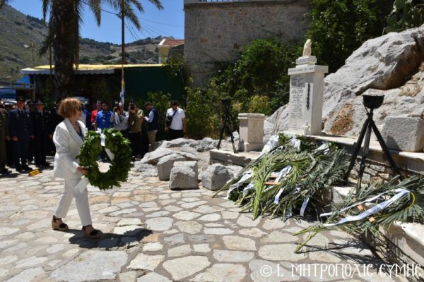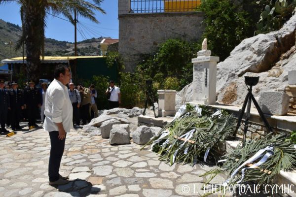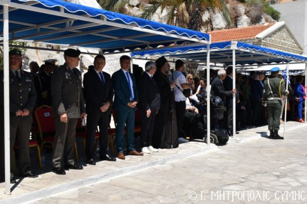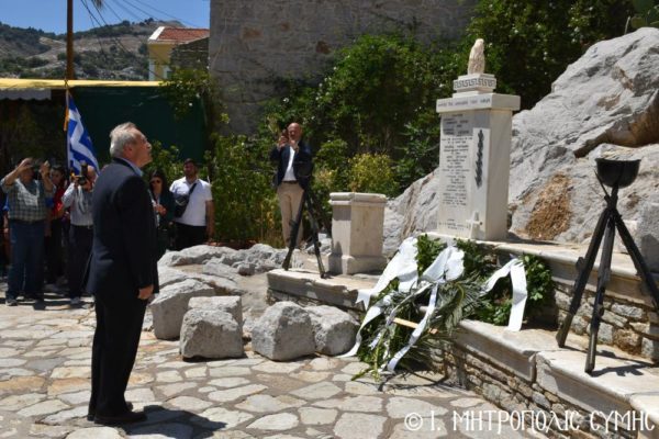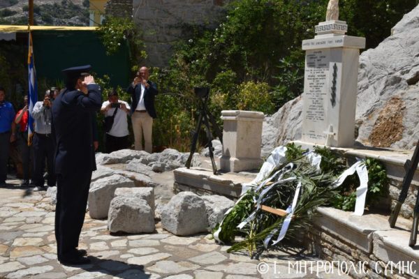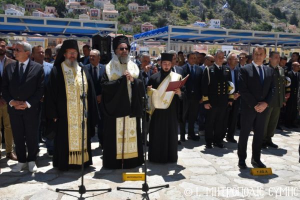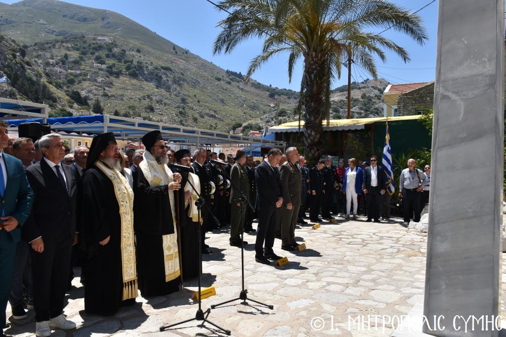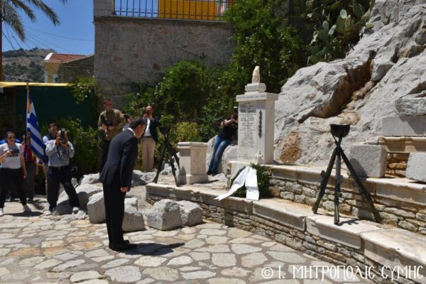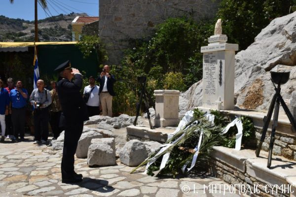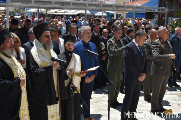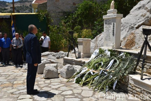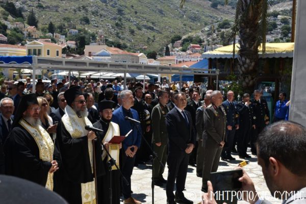 Ακολούθως ο Σεβασμιώτατος Μητροπολίτης Σύμης κ. Χρυσόστομος προέστη της επιμνημοσύνου δεήσεως προ του Ηρώου των Πεσόντων, μετά την οποία έγινε η κατάθεση στεφάνων από τον Εκπρόσωπο της Ελληνικής Κυβερνήσεως, Υπουργό Εθνικής Αμύνης κ. Νικόλαο Παναγιωτόπουλο, τον Εκπρόσωπο των Ενόπλων Δυνάμεων και Αρχηγό του Γενικού Επιτελείου Στρατού, Στρατηγό Κωνσταντίνο Φλώρο, τον Περιφερειάρχη Νοτίου Αιγαίου κ. Γεώργιο Χατζημάρκο, τον Δήμαρχο Σύμης κ. Ελευθέριο Παπακαλοδούκα, και όλους τους Εκπροσώπους των λοιπών Πολιτικών, Στρατιωτικών, Αστυνομικών και Λιμενικών Αρχών, Φορέων, Συλλόγων, των λοιπών Ενώσεων, Οργανισμών, Επιτροπών και παροικιακών Συλλόγων της Νήσου, ως και των Εκπαιδευτικών της Σύμης. Η σεμνή τελετή έκλεισε με την ανάκρουση του Εθνικού Ύμνου.