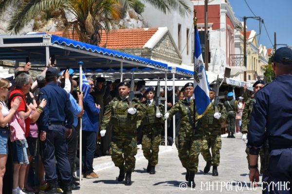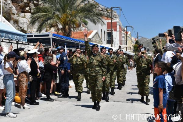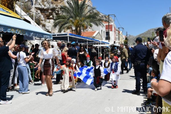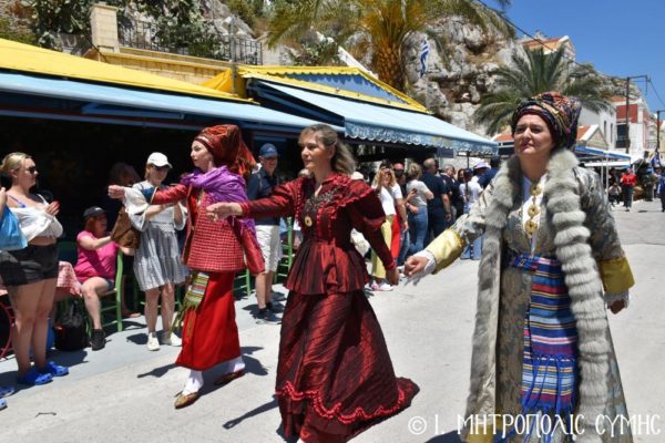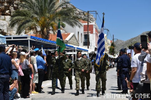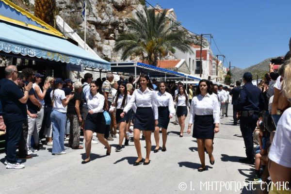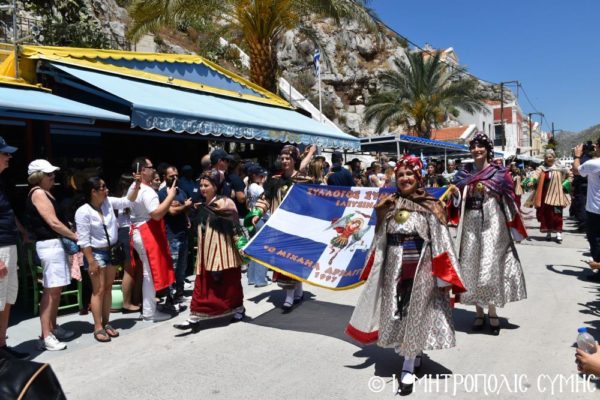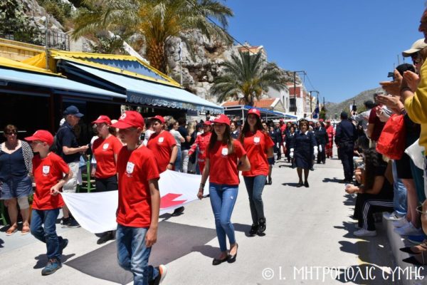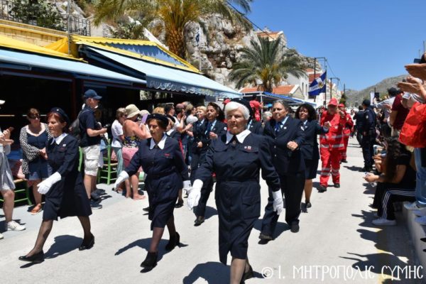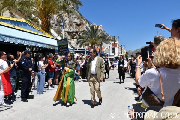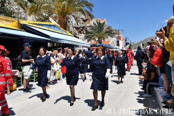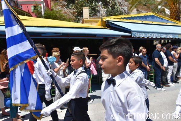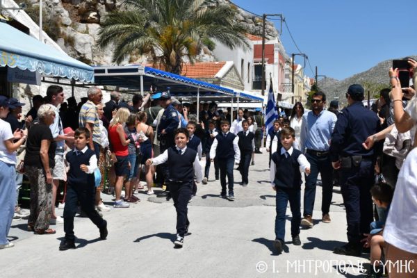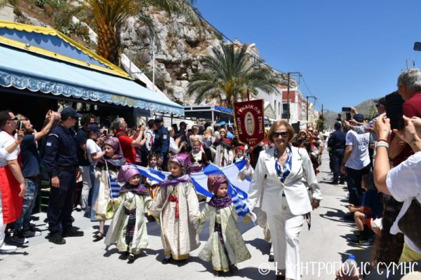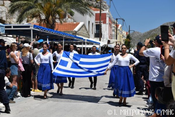 Ακολούθησε η παρέλαση τμημάτων προ των Επισήμων, των μαθητών των Σχολείων, των μελών των Συλλόγων με παραδοσιακές ενδυμασίες και του Στρατού. Η εκδήλωση έκλεισε με παράθεση γεύματος και παραδοσιακούς Δωδεκανησιακούς χορούς, που χόρεψε το χορευτικό της Ενώσεως Γυναικών Σύμης, ως και το χορευτικό της κ. Ειρήνης Μυλωνάκη.