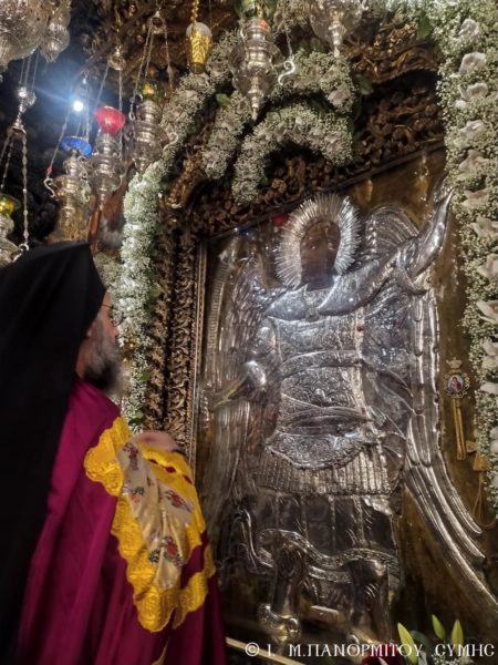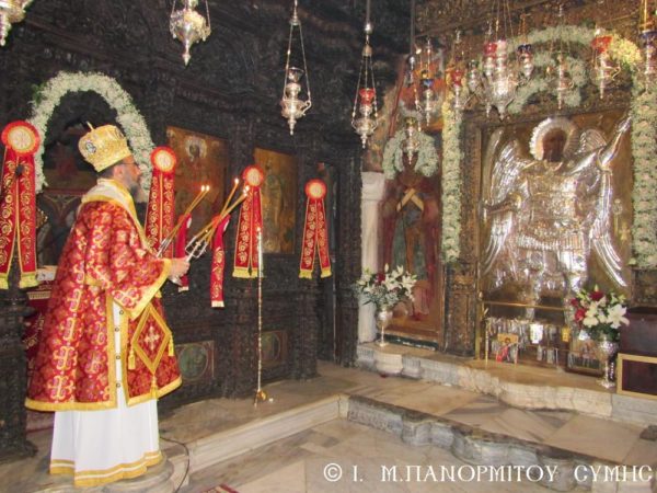 Την Κυριακή 8η Νοεμβρίου και ώρα 07:00 έλαβε χώρα η έναρξη του Όρθρου και ακολούθησε η Θεία Λειτουργία, την οποία τέλεσε ο Σεβασμιώτατος. Εφέτος, κατά τα ισχύοντα δεν πραγματοποιήθηκε η καθιερωμένη Λιτανεία της Ι. Εικόνος πέριξ της Ι. Μονής, ούτε παρετέθη εορταστική τράπεζα. Μετά την απόλυση ο Σεβασμιώτατος μετά του Καθηγουμένου, συνοδευόμενοι υπό του Δημάρχου Σύμης κ. Ελευθερίου Παπακαλοδούκα και του Αντιδημάρχου κ. Νικήτα Γρύλλη, οι οποίοι παρέστησαν και στην Θ. Λειτουργία, μετέβησαν στο Ηρώο του Εθνομάρτυρος Ηγουμένου της Μονής Αρχιμ. Χρυσάνθου Μαρουλάκη και των δύο άλλων Ηρώων Φλώρου Ζουγανέλη και Μιχαήλ Λάμπρου, των εκτελεσθέντων υπό των Ιταλών το 1944, όπου ανεπέφθη Δέησις υπέρ αναπαύσεως των ψυχών τους.