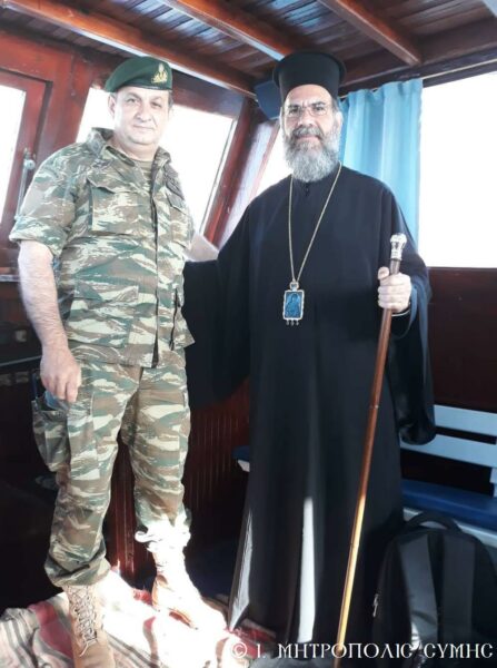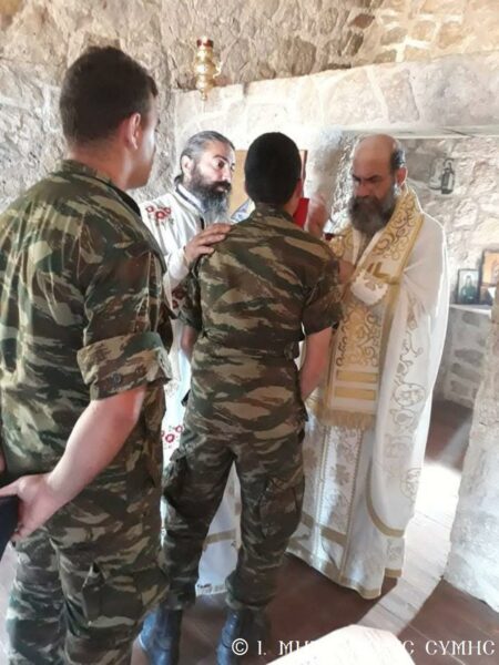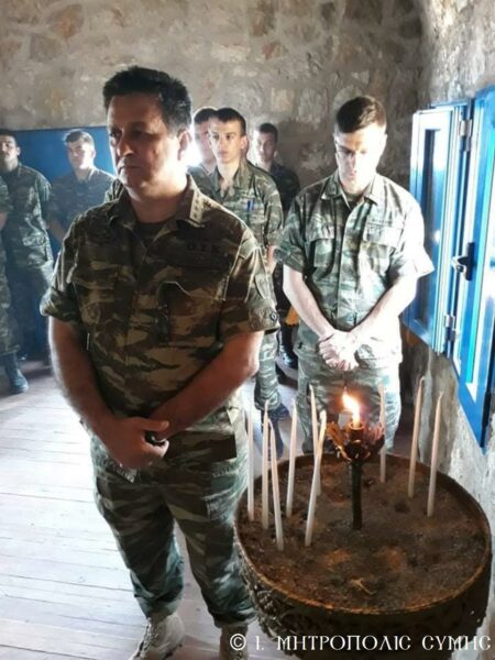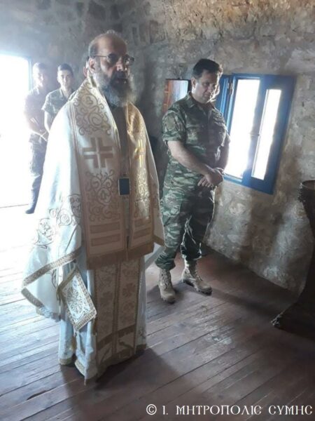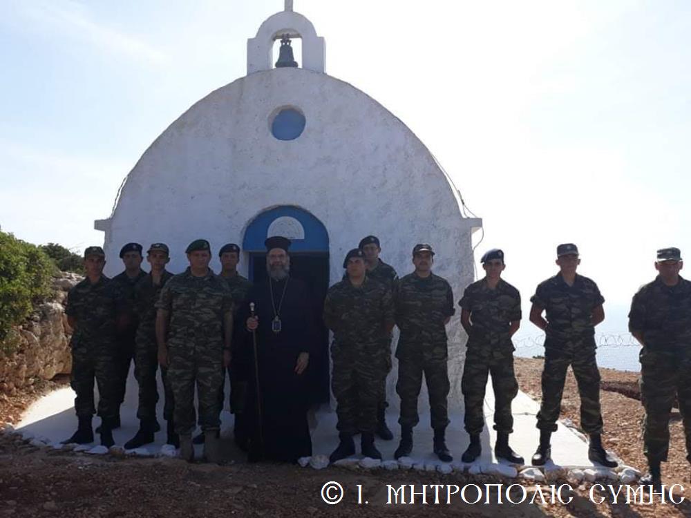 Ἐκκλησιάστηκαν μέ περισσή εὐλάβεια καί συγκίνηση τά ἐκεῖ ὑπηρετοῦντα στρατευμένα παιδιά τῆς Πατρίδας, ἐνῶν παρών ἦταν καί ὁ Στρατιωτικός Διοικητής κ. Γρηγόριος Γαρουφαλιάς, στόν ὁποῖο ὁ Σεβασμιώτατος παρέδωσε καί ἐξοπλισμό γιά τά τρία ἐξωκλήσια τοῦ στρατιωτικοῦ σχηματισμοῦ τῆς συστάδος τῶν Νήσων τῆς Μεγίστης. Στό ἀπέριττο ἐκκλησάκι τοῦ Ἁγίου Νικολάου, τελέστηκε μέ τήν τυπική σειρά του ὁ Ὄρθρος καί ὁ λειτουργός Μητροπολίτης μας, εὐλαβικά προσκόμισε τά τίμια Δῶρα στόν Ποιητῆ οὐρανοῦ καί γῆς, ἐνῶ μελωδικώτατα ἔψαλλε ὁ χορός ὑπό τήν διεύθυνση τοῦ Ἱεροψάλτη κ. Ἐμμανουήλ Κυπριώτη. Ἡ Θεία Μυσταγωγία ὁλοκληρώθηκε ἥρεμα καί κατανυκτικά στό ταπεινό αὐτό Ναΰδριο, ὅπου οἱ συμμετέχοντες προσέγγισαν τίς καρδιές τους προσευχητικά, «εἰκονίζοντες μυστικῶς τά Χερουβίμ καί προσάδοντες τῇ ζωοποιῷ Τριάδι τόν Τρισάγιον Ὕμνον». Πολλοί δέ ἐκ τῶν στρατιωτῶν προσῆλθαν στό Ποτήριο τῆς Ζωῆς.