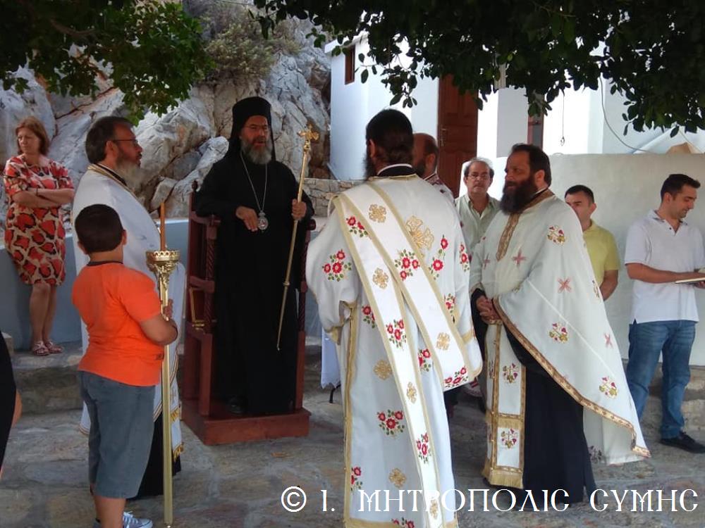 Ο Σεβ. Μητροπολίτης Σύμης κ. Χρυσόστομος, χοροστάτησε στόν πανηγυρικό Ἑσπερινό ὁ ὁποῖος τελέστηκε στό γραφικό ἐκκλησάκι τοῦ Προφήτου Ἠλία τοῦ «ἀνηφόρου», πού βρίσκεται σκαρφαλωμένο στήν βραχώδη πλαγιά τοῦ βουνοῦ, πάνω ἀπό τόν ὅρμο τοῦ Πανορμίτη. Τόν πλαισίωσε ὁ Ἡγούμενος τῆς Ἱ. Μονῆς π. Ἀντώνιος Πατρός, ὁ π. Δημήτριος Γεωργιάδης, ὁ π. Γεώργιος Χατζηχρυσάφης καί ὁ Διάκονός του π. Γεώργιος Κακακιός.
