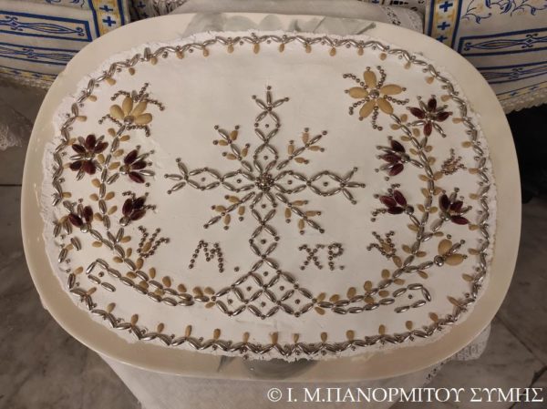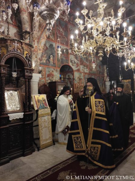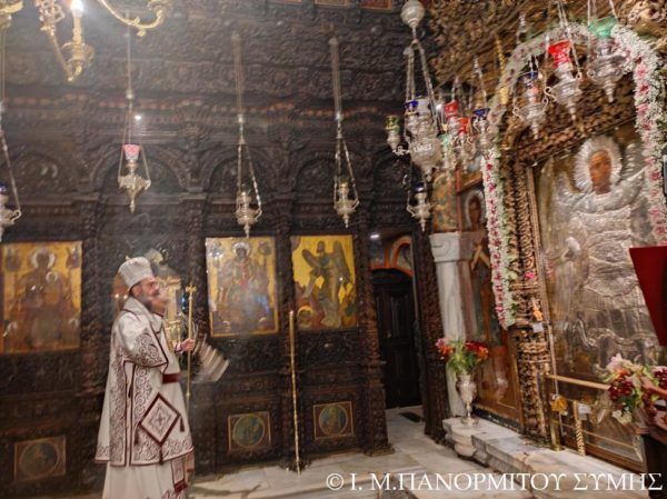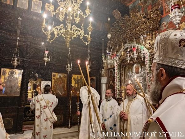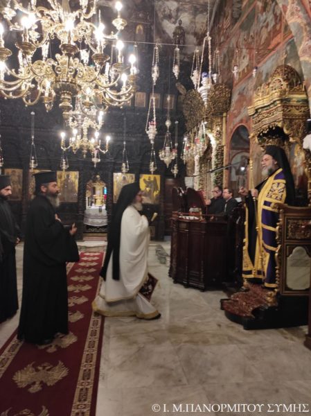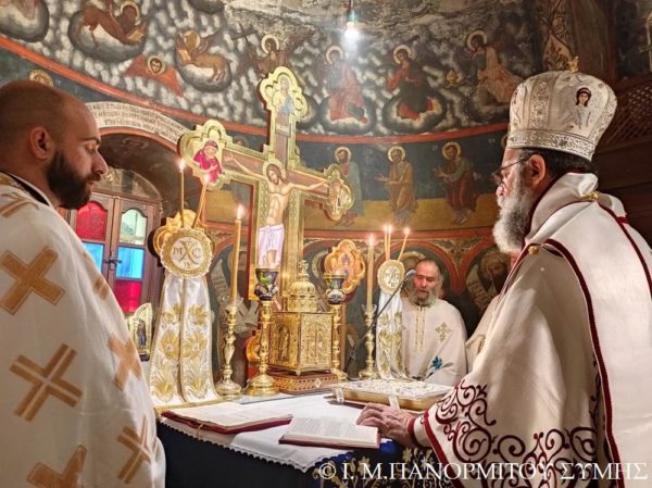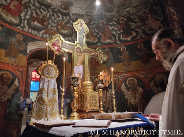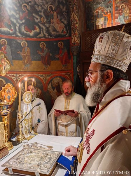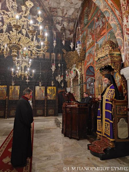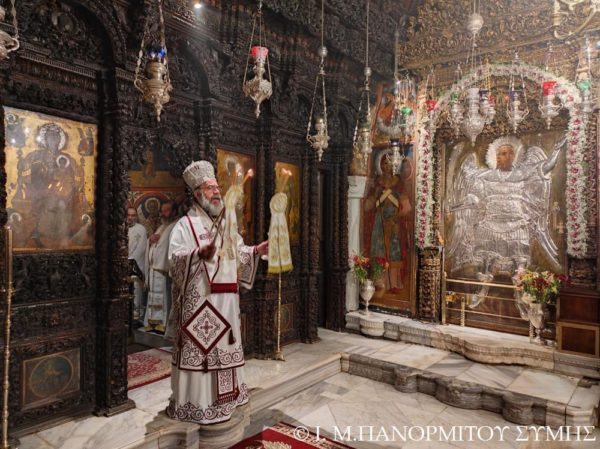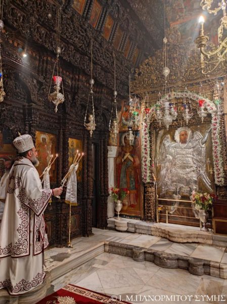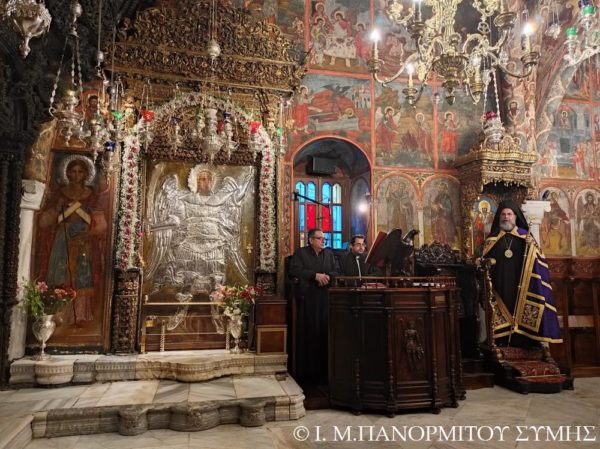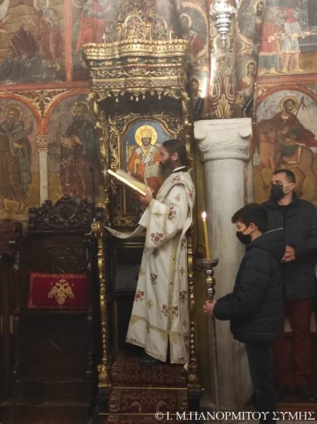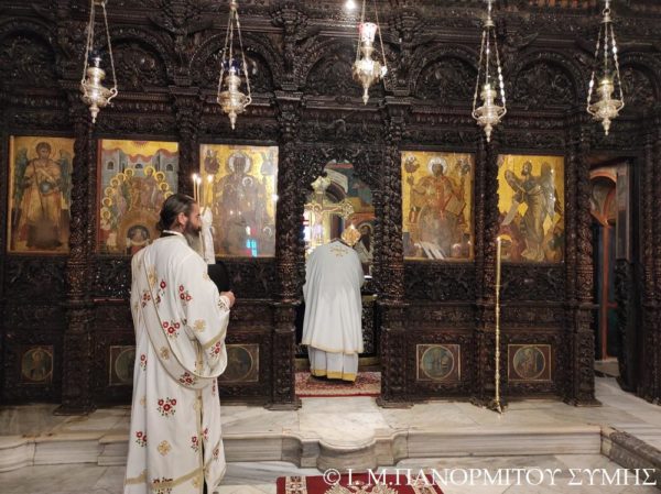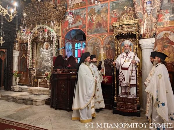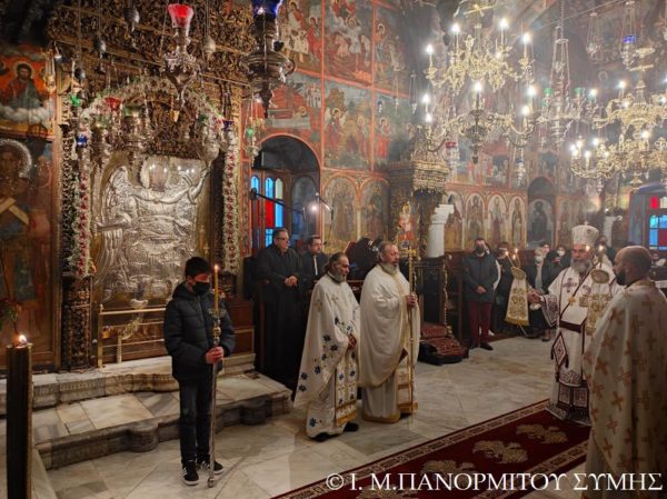 Ο Σεβασμιώτατος Μητροπολίτης Σύμης κ. Χρυσόστομος, χοροστάτησε του Όρθρου, τέλεσε την Θεία Λειτουργία και εν συνεχεία μετά την απόλυση, προέστη του Ιερού Μνημοσύνου. Συλλειτουργοί του ήταν ο Πανοσιολ. Καθηγούμενος της Ι. Μονής, Αρχιμανδρίτης τού Οικουμενικού Θρόνου Αντώνιος Πατρός, ο Ιερομόναχος π. Ανδρέας Δημητρίου, ο Πρεσβύτερος π. Παντελεήμων Μακρόπουλος και ο Διάκονος π. Γεώργιος Κακακιός. Την ιερά υμνωδία απέδωσαν γλυκυφθόγγως ο Πρωτοψάλτης της Ι. Μονής κ. Μερκούριος Γιανναράς και ο Ιεροψάλτης της Ενορίας Ευαγγελισμού Σύμης κ. Αγαπητός Μιχελλής, αμφότεροι Αναγνώστες.