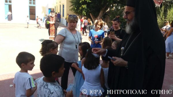 Συγκεκριμένα, συμπαραστατούμενος ἀπό τόν π. Στέφανο Μακρῆ Γεν. Ἀρχιερατικό του Ἐπίτροπο, καθώς καί τόν διάκονό του π. Γεώργιο Κακακιό, προέστη τῆς Ἀκολουθίας στά δυό Νηπιαγωγεῖα, τά δυό Δημοτικά «Πετρίδειο» καί «Ἰωαννίδειο», στό ΕΠΑΛ, τό Ἑνιαῖο Λύκειο καί «Πανορμίτειο» Γυμνάσιο.