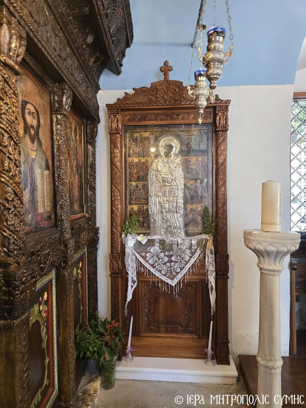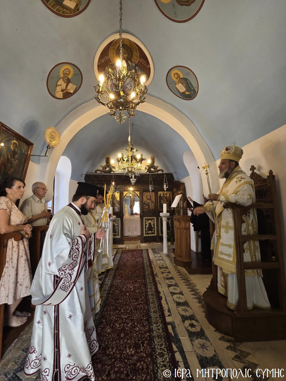 Καθ’ όλην την διάρκεια της Θ. Λειτουργίας οι πιστοί συνέρρεαν ευλαβικά για να προσκυνήσουν την Ιερά εφέστια Εικόνα της εορταζομένης Αγίας και παράλληλα να επισκεφθούν τους τάφους των προσφιλών τους, αποδεικνύοντας έτσι, ότι στην Ορθόδοξη πίστη και παράδοση, οι νεκροί λογίζονται απλά κεκοιμημένοι των οποίων προσδοκούμε την ανάσταση. Ο δε Σεβασμιώτατος προ της απολύσεως, τέλεσε Τρισάγιον υπέρ μακαρίας μνήμης και αιωνίου αναπαύσεως αυτών, ευχόμενος προς το εκκλησίασμα, διά πρεσβειών της εορταζομένης Αγίας, έτη πολλά με υγεία κατ’ άμφω, δύναμη και σθένος.